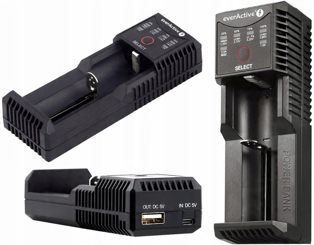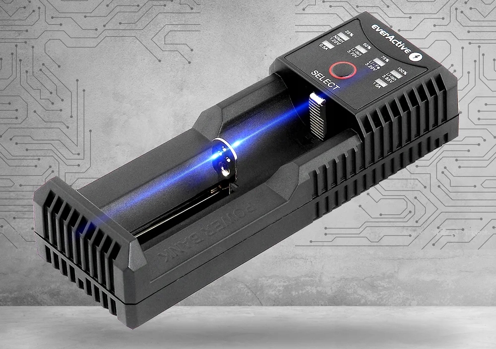 EverActive UC-100C — усовершенствованное мультизарядное устройство на один элемент/батарею. В устройстве используется усовершенствованный микропроцессор для управления процессом зарядки. Пользователю доступны два зарядных тока (по выбору): 500 мА и 1000 мА.