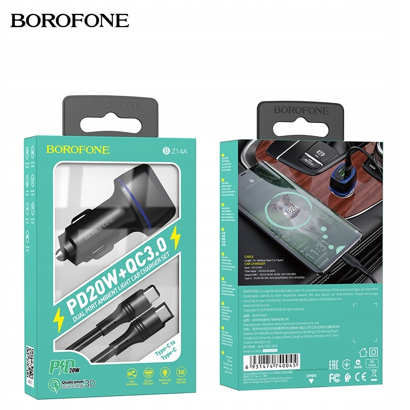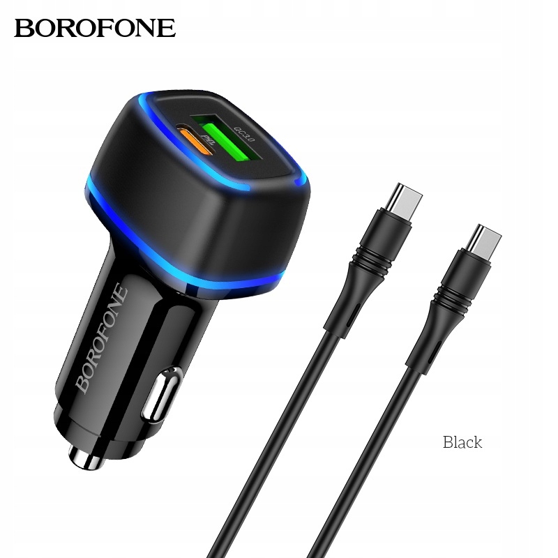BOROFONE BZ14A Mercury — это автомобильное зарядное устройство с двумя портами USB: один USB Type-A в стандарте Quick Charge 3.0/QC3.0 и другой USB Type-C в стандарте USB Power Delivery PD20W. Обе розетки имеют максимальную мощность 3А, само зарядное устройство имеет суммарную мощность двух розеток также максимум 3А. Зарядное устройство имеет дополнительную светодиодную подсветку и кабель с двумя разъемами USB Type-C, предназначенный для устройств Android.