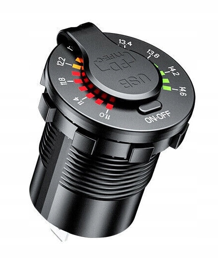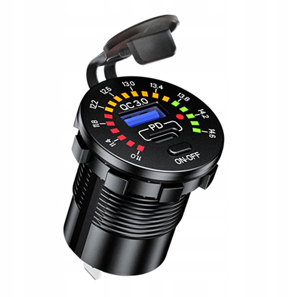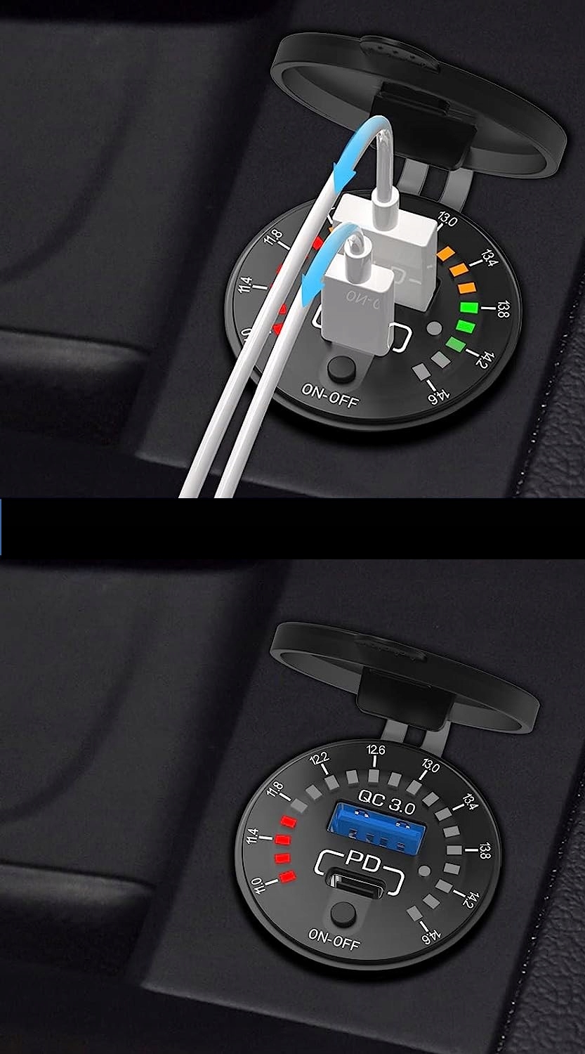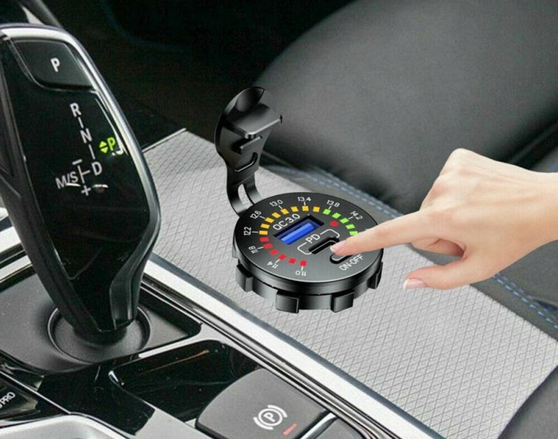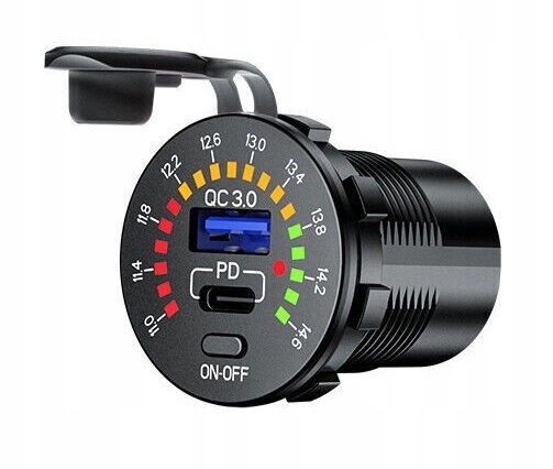Зарядное устройство с цифровым вольтметром, отображающим текущий уровень напряжения аккумулятора, и с двумя USB-портами: быстрая зарядка QC3.0 и PD USB C. Комплект позволяет одновременно использовать обе розетки, т.е. заряжать, например, навигацией и телефоном одновременно.