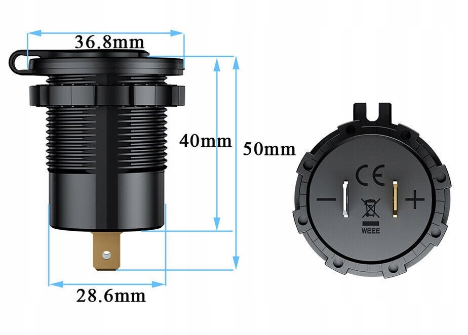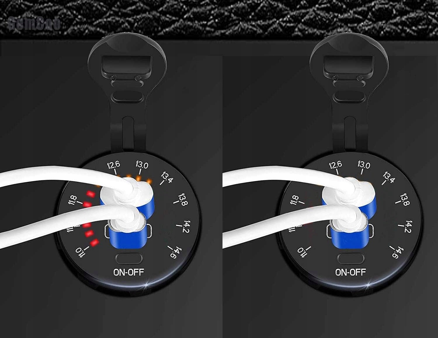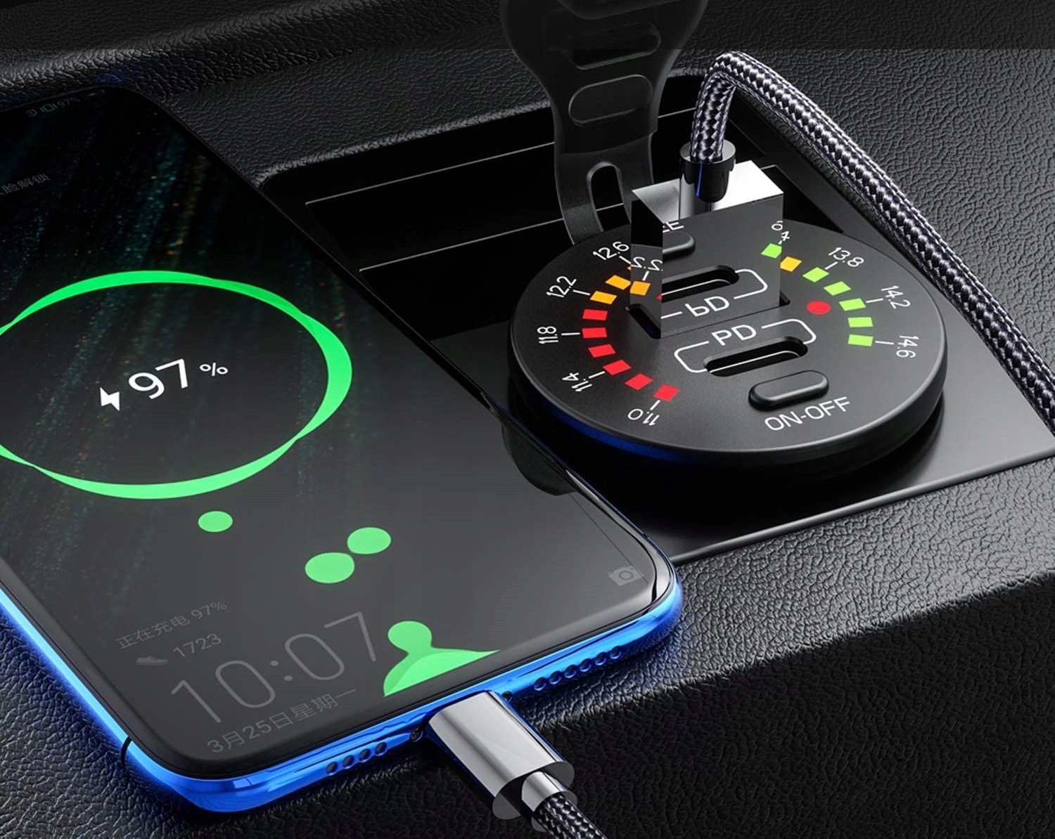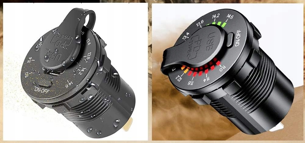 Зарядное устройство с цифровым вольтметром, отображающим текущий уровень напряжения аккумулятора, и с двумя USB-портами: быстрая зарядка QC3.0 и PD USB C. Комплект позволяет одновременно использовать обе розетки, т.е. заряжать, например, навигацией и телефоном одновременно.