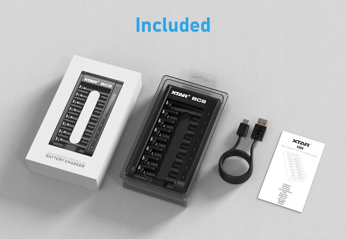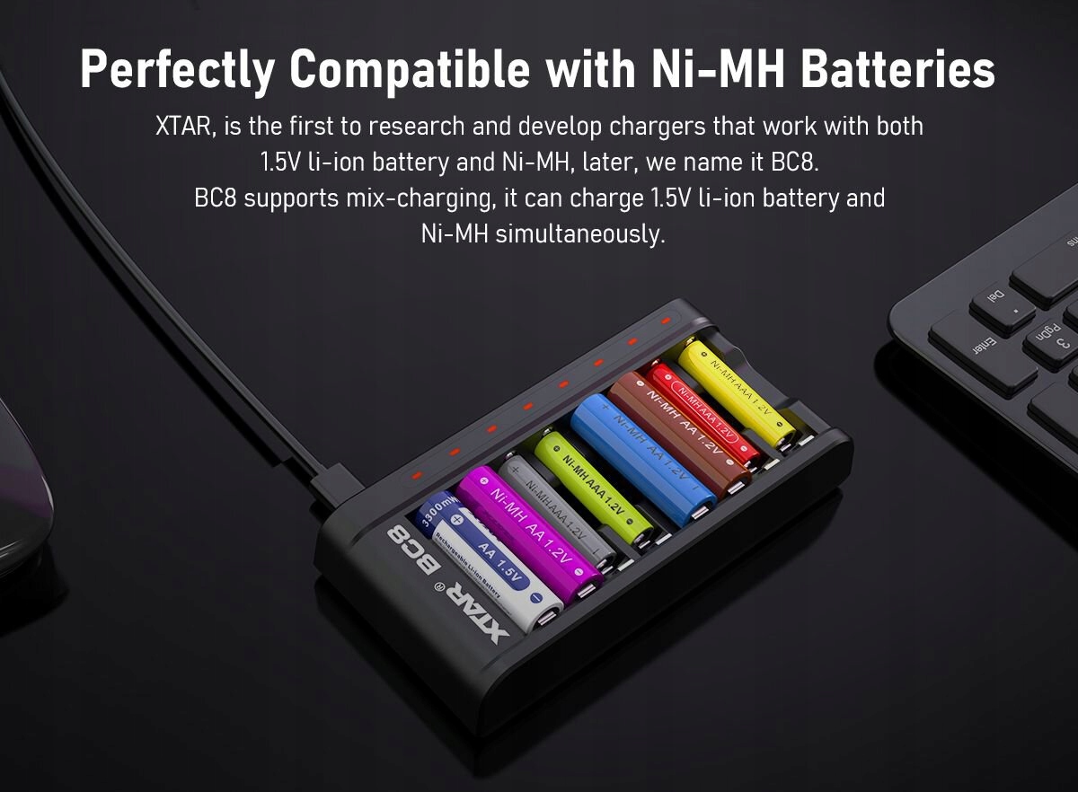 xtar Bc8 Зарядное устройство имеет расширенный процессор, который может различать тип батареи, установленного в нем. Благодаря этому мы можем загрузить любую литий-ION 1,5 В или NI-MH батарею в каждом розетке. Уточненный алгоритм зарядки обеспечит зарядку батареи всегда на полной и оптимальной, безопасной для химии ячейки.