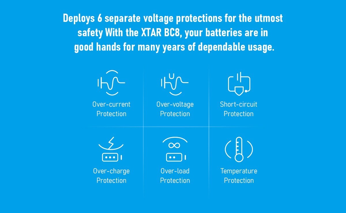Как и любое зарядное устройство Xtara, модель BC8 обеспечена всеми возможными способами. Наиболее важными защитами, которые он имеет: