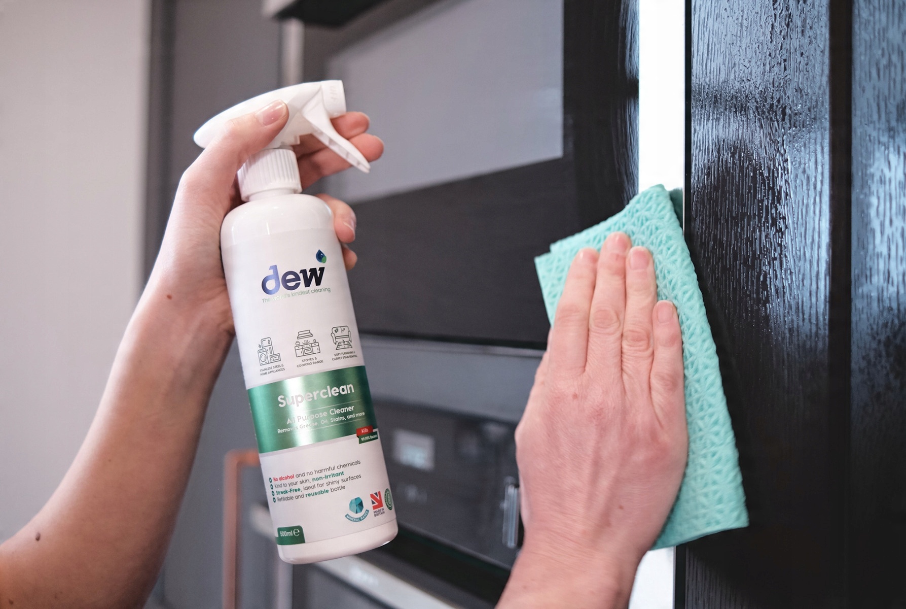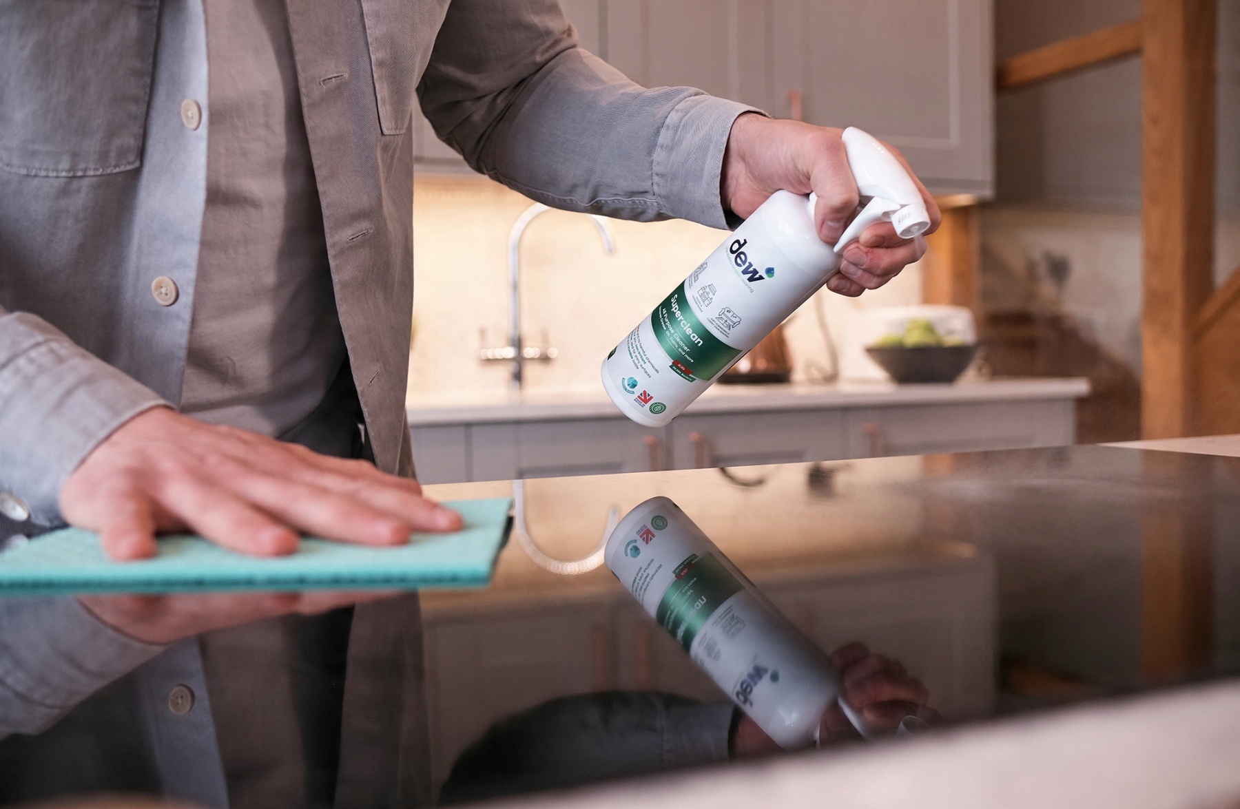 Универсальное чистящее средство Dew Superclean отличается низким выбросом углекислого газа и поставляется в многоразовых контейнерах, что позволяет сэкономить деньги и сократить количество пластиковых отходов.