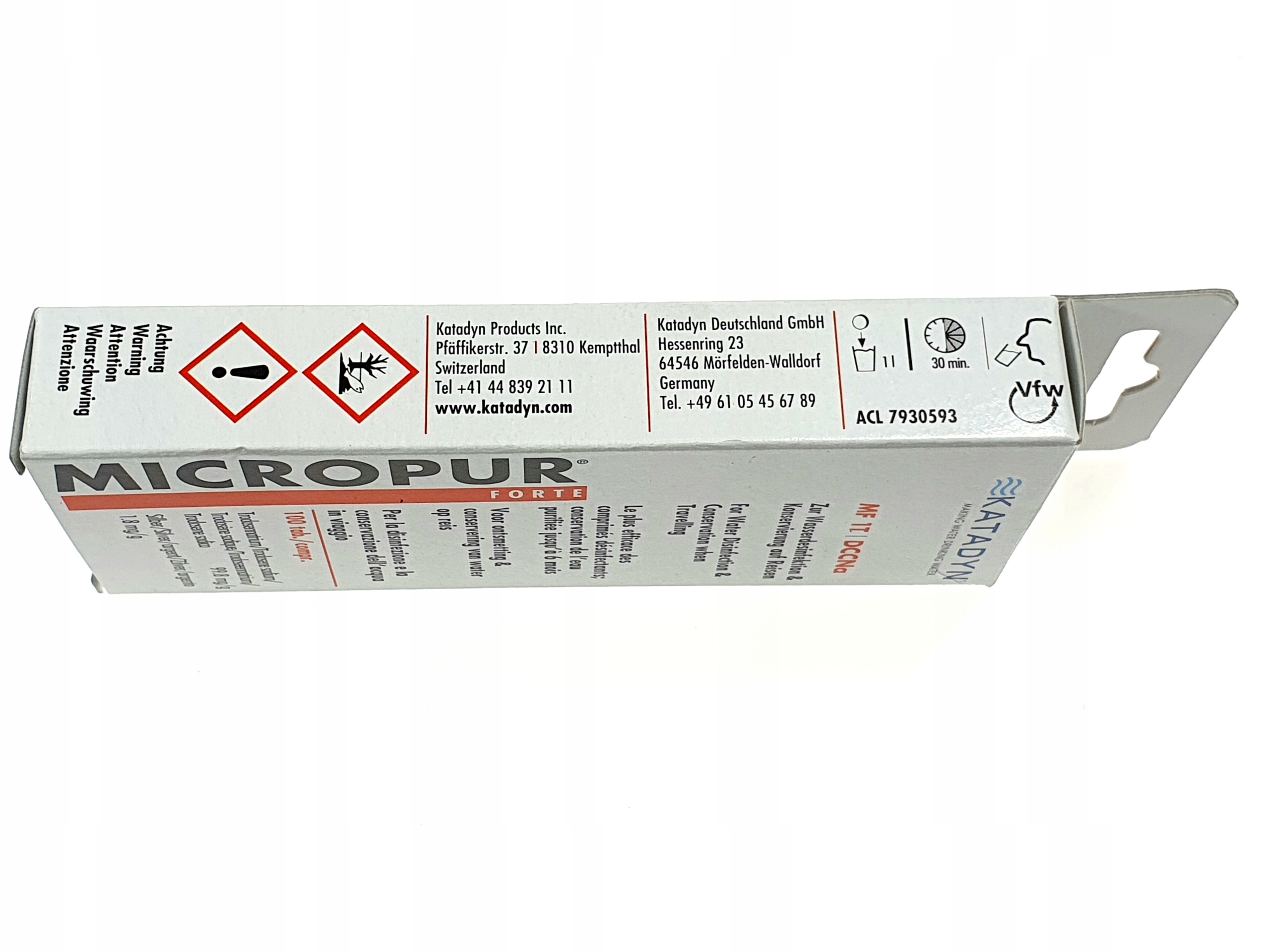 - Таблетки Micropur Forte от Katadyn – это таблетки быстрого действия для очистки питьевой воды. Они эффективно уничтожают вирусы, бактерии и простейшие. Благодаря использованию ионов серебра и NaDCC (натриевая соль дихлоризоциануровой кислоты – выделяет свободный хлор) вода быстро становится питьевой и долго остается свежей