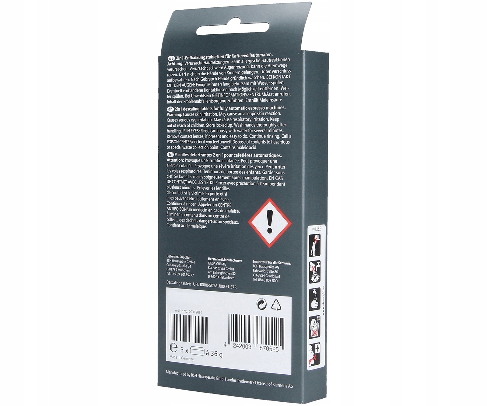 Таблетки TZ80002B серии EQ прекрасно удаляют белый налет со стенок контейнера для воды в каждой кофемашине. После введения в устройство таблетка Siemens растворяет накипь, присутствующую на стенках системы и заварочном модуле. Таблетки TZ80002B EQ эффективно удаляют накипь, заботясь о системе нагрева кофемашины. Они обеспечивают длительную защиту от накипи в водопроводных линиях. Они не меняют вкус приготовленных напитков и оставляют безопасный аромат.