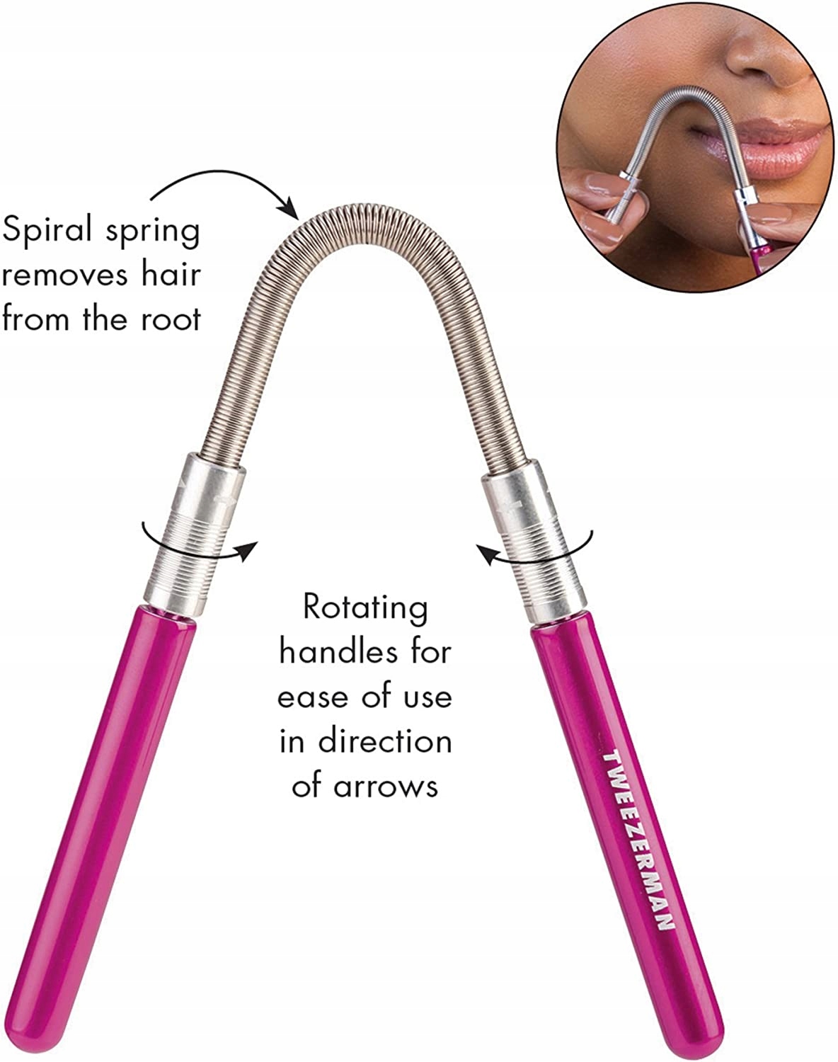 Уникальные ручки и высококачественная спираль из нержавеющей стали успешно удаляют нежелательные волосы с участков без использования воска или химикатов