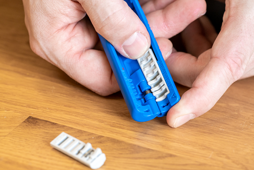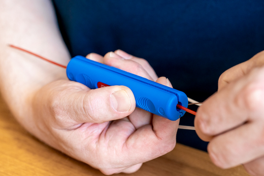 Инструмент для зачистки изоляции специальных буферных трубок на оптоволоконных кабелях диаметром 1,2 мм – 4 мм. Работает с гильзами с жилами, например, из полиэтилена, с толщиной стенок 0,15–0,6 мм.