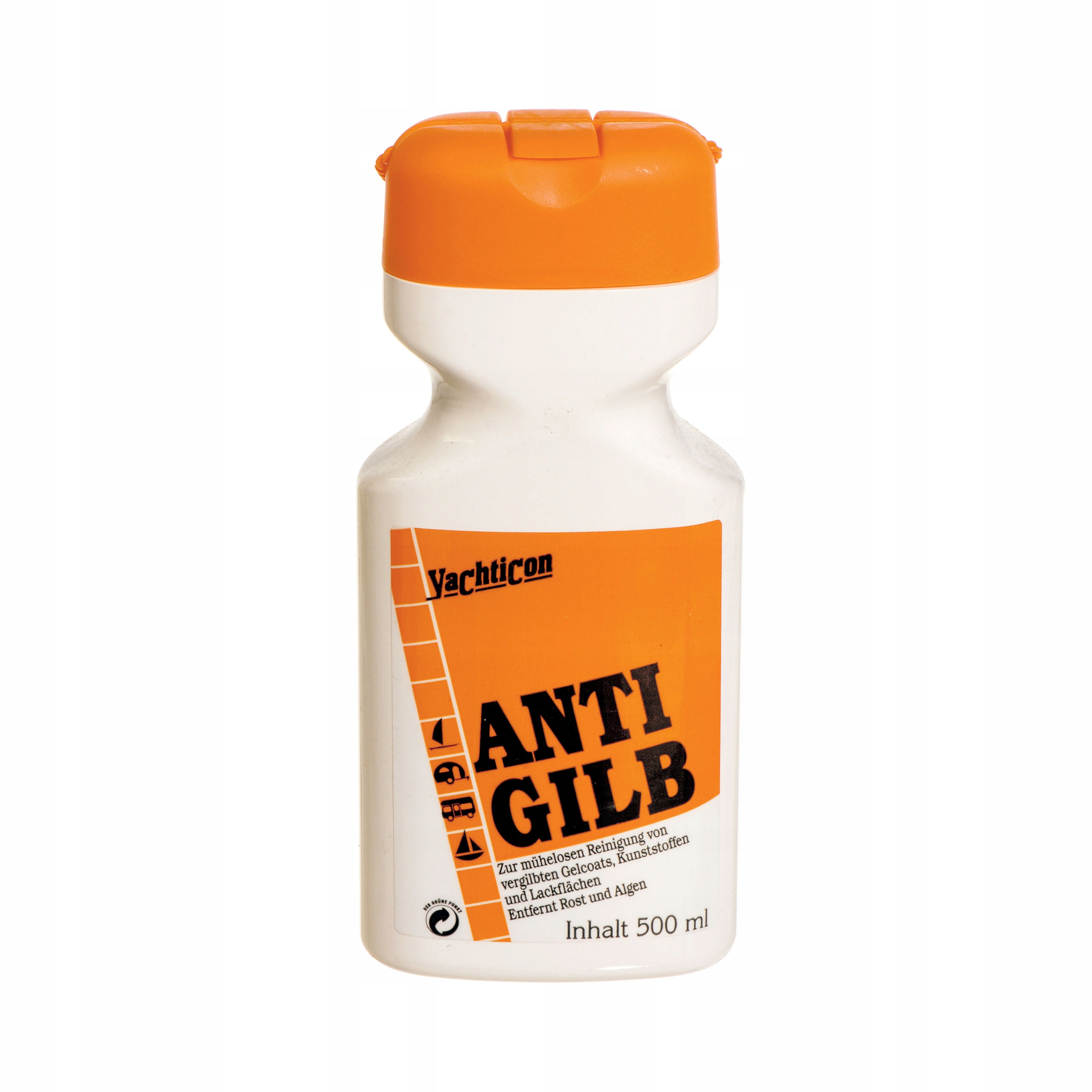 Yachticon Anti Gilb — продукт, специально разработанный для удаления желтых пятен с гелькоута и краски — так называемый «желтая волна» на носу, ватерлинии и вокруг выхлопной трубы. Очень прост в использовании – просто нанесите средство спонжем, оставьте на 5 минут, а затем смойте водой. Он также удаляет пятна ржавчины и водорослей.