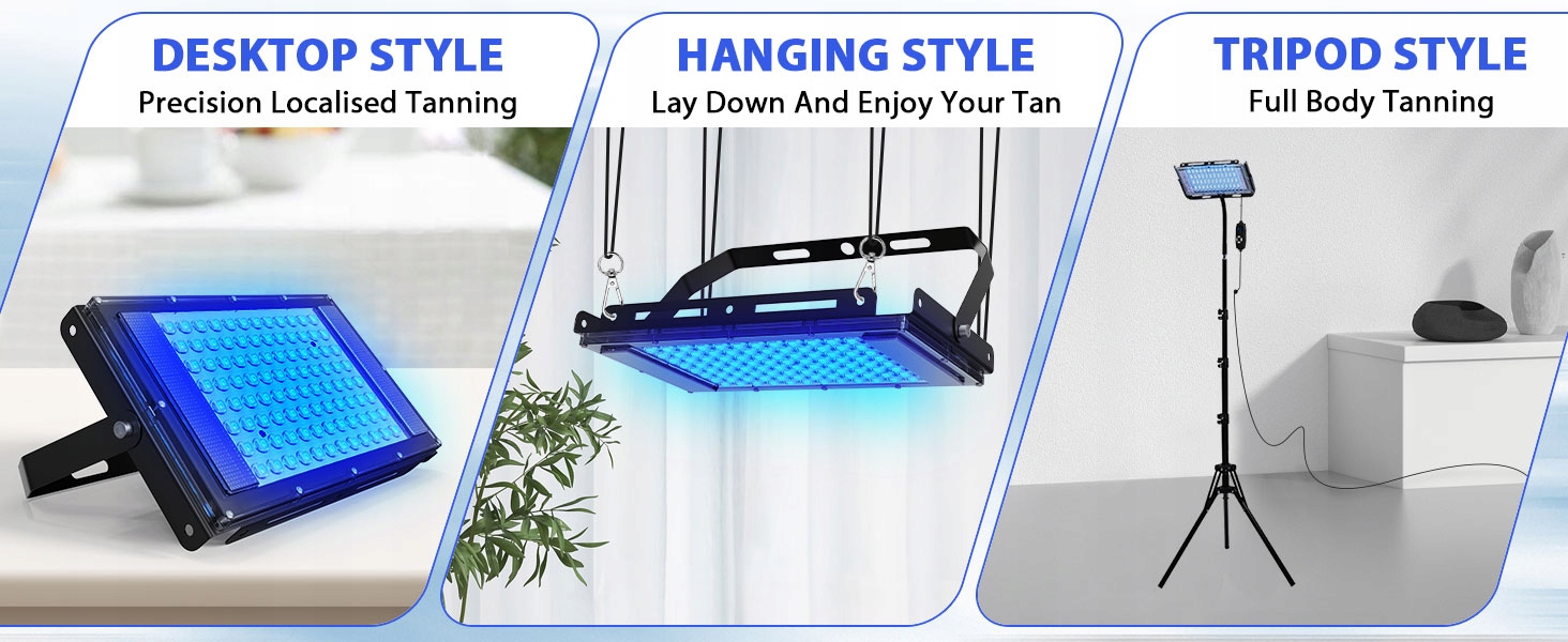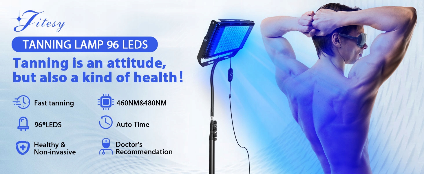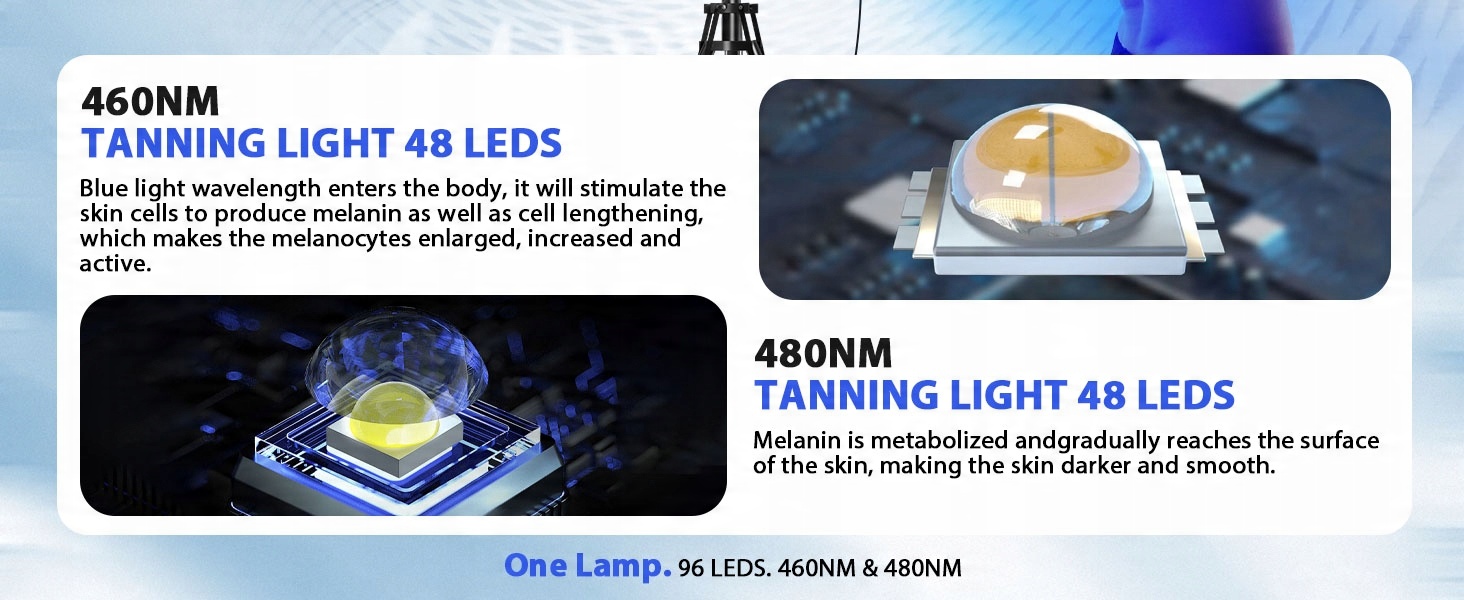 【Профессиональные тесты】 Джайтси -загара состоит из 48 * 460 нм и 48 * 480 нм. Двойные длины волны в сочетании со специальными лампами и технологией фильтрации безопасности гарантируют, что кожа не будет повреждена во время воздействия солнца. Синий свет эффективно стимулирует клетки кожи для производства меланина и удлинения клеток, что приводит к увеличению, повышенным и активным меланоцитам, которые постепенно достигают поверхности кожи и делают ее темной и гладкой. Треугольный загар стоят для всего тела, в стиле рабочего стола для точного локального загара и стиля, чтобы повесить, чтобы лечь и легкое загар всего тела. Вы можете выбрать любые настройки в зависимости от ваших потребностей. Длина сегмента штатива может быть свободно регулирована, а также установлена под многими точками. Удовлетворить все ваши потребности.