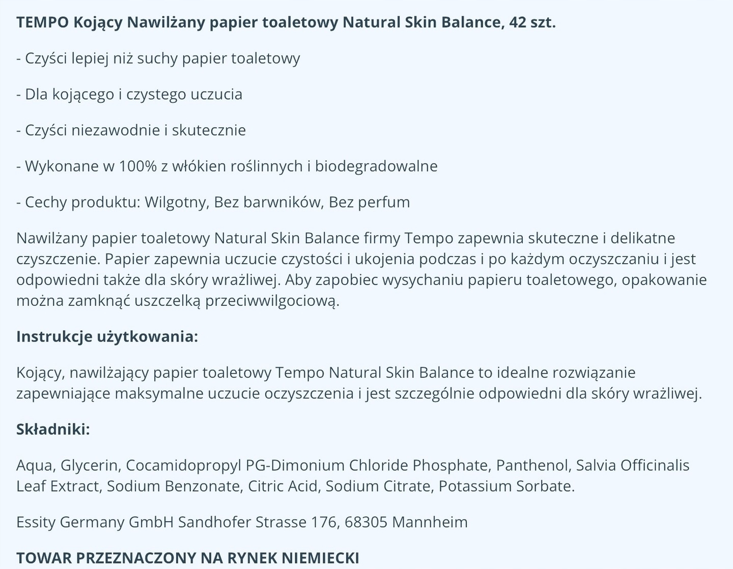 Просматривая «Успокаивающий темп увлажненной туалетной бумаги Натуральный баланс кожи, 42 шт.», вы можете быть уверены, что данный товар из каталога «Салфетки для интимной гигиены» будет доставлен из Польши и проверен на целостность. В цене товара, указанной на сайте, учтена доставка из Польши. Внимание!!! Товары для Евросоюза, согласно законодательству стран Евросоюза, могут отличаться упаковкой или наполнением.