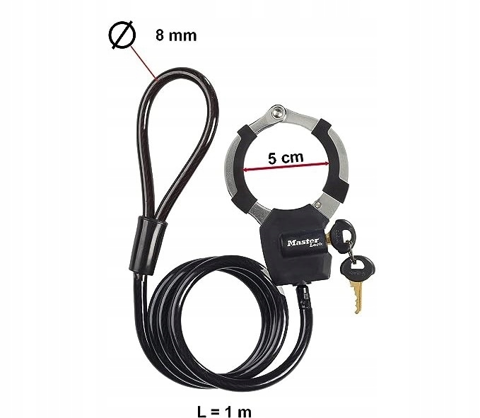 Трос крепится «наручниками» с ключом – Street Cuff® Master Lock, изготовлен из стальной оплетки длиной 1 м и сечением 8 мм. Кабель обеспечивает большую гибкость и легко крепится к парковочному счетчику, столбу забора или сетке забора. Защитное виниловое покрытие защищает от царапин. Механизм замка со встроенными защелками обеспечивает большую устойчивость к взлому. Яркие цвета облегчают идентификацию.
