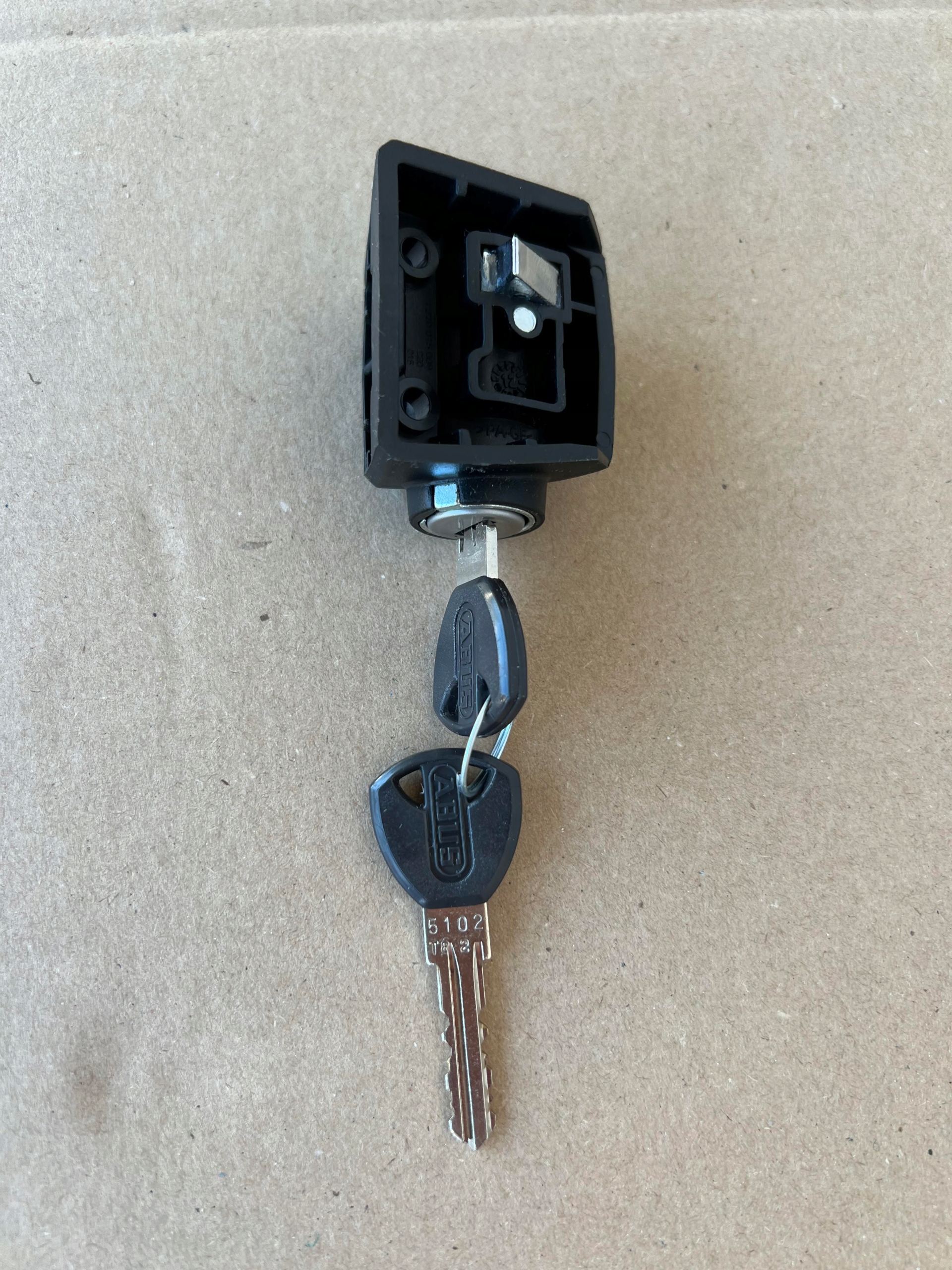 Цилиндр замка аккумулятора багажника Bosch eBike является частью держателя аккумулятора багажника. В комплект входят два ключа Abus.