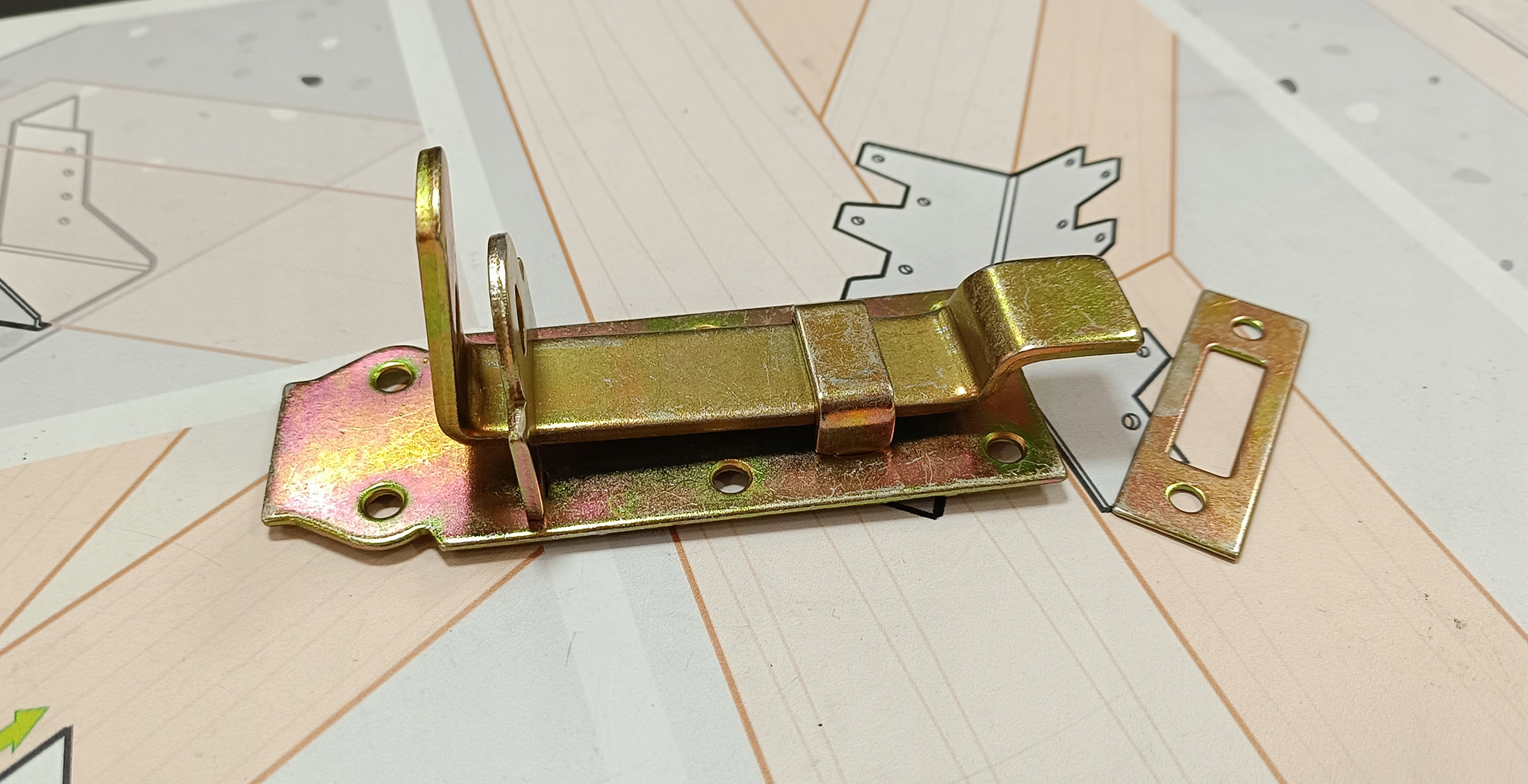 Ригель WZW 120 с изогнутым ригелем представляет собой элемент из оцинкованного листового металла размерами 120x45x5,0 мм. Он доступен в золотом цвете и используется в качестве закрывающего элемента в дверях, сундуках или ставенах. Крепится с помощью болтов, шурупов или гвоздей. Он отличается не только добротным качеством изготовления, но и эстетичным внешним видом. Его можно использовать как в деревянных, так и в стальных конструкциях. Защелка закрывается навесным замком, что обеспечивает дополнительный уровень безопасности