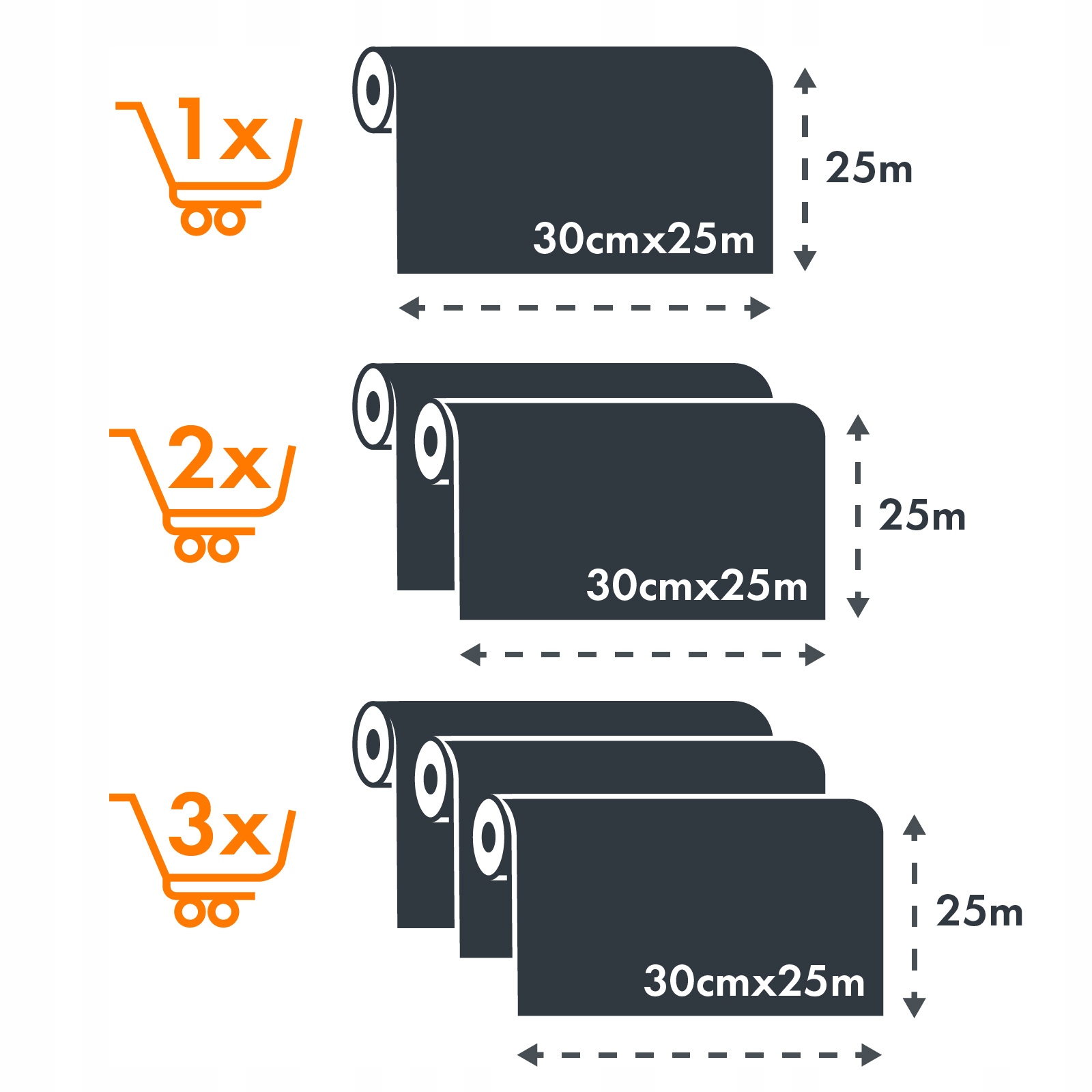 При покупке 3 штук вы получите 3 отдельных рулоны, каждый размером 30 см x 25 м.