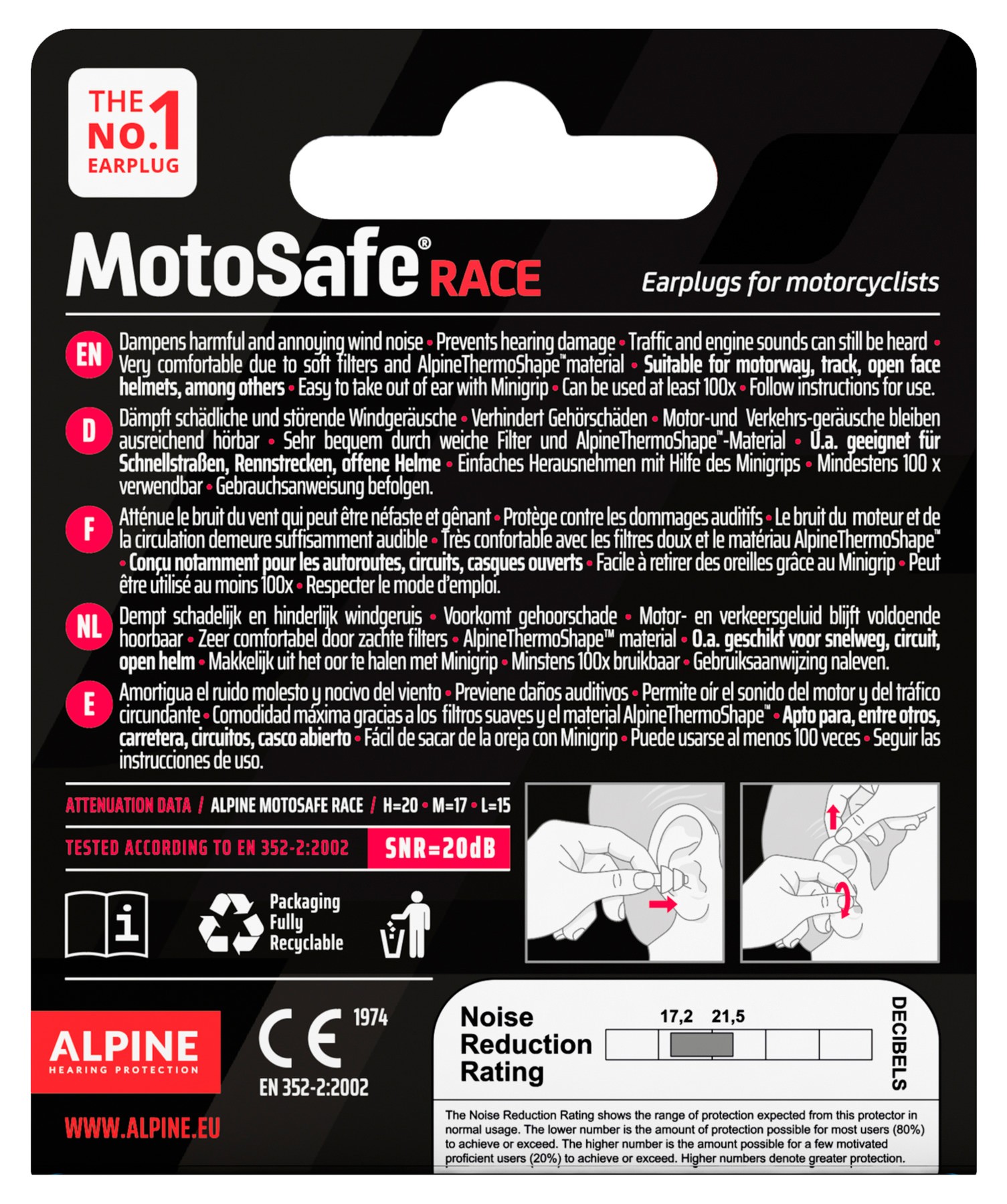 MotoSafe® Race MotoGP™: идеальные затычки для ушей для мотоциклистов на шоссе, треке или при езде с наушниками открытый шлем. Буруши MotoSafe® эффективно подавляют вредные звуки, не вызывая чувства изоляции. Благодаря инновационным фильтрам AlpineAcousticFilters™ звуки движения, навигации, внутренней связи и мотоцикла остаются четко слышимыми. Alpine MotoSafe® доступен в различных вариантах, адаптированных к различным условиям использования. Например, гонки на треке требуют большей защиты, чем обычные прогулки. Специальная версия MotoGP™ этих берушей обеспечит необходимую безопасность ваших ушей во время интенсивной езды!