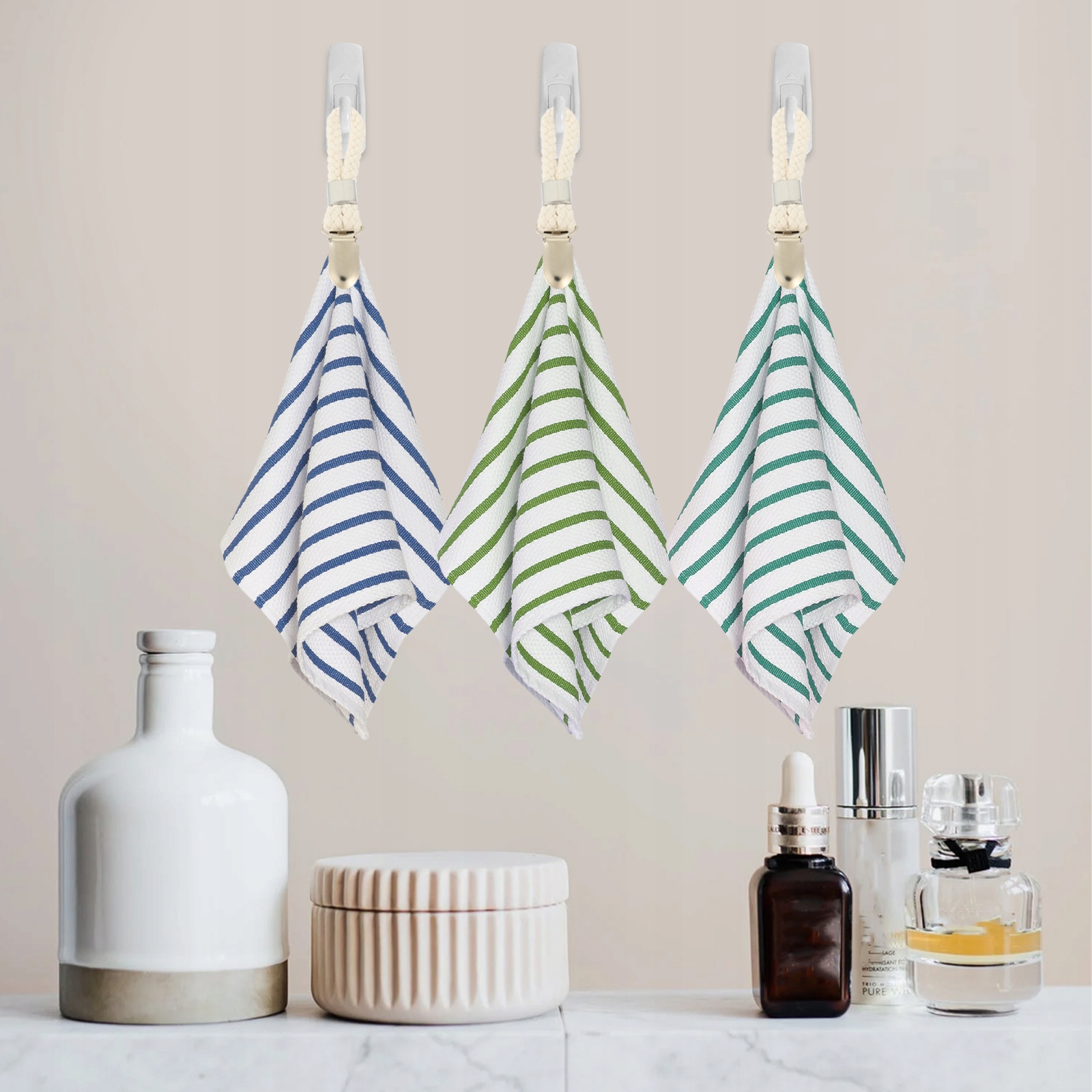 Этот зажим, оснащенный петлей из хлопковой веревки, можно легко повесить на большинство крючков или вешалок.