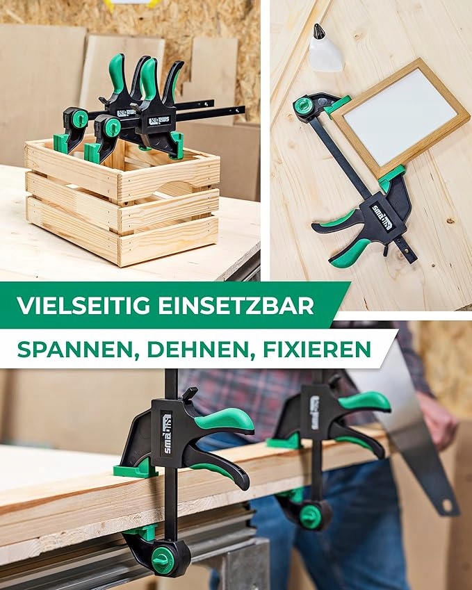 Набор из 2 прочных одноручных струбцин — незаменимый инструмент в каждой мастерской. Благодаря высокой силе прижима – до 71 кг – вы сможете легко обездвижить, растянуть или закрепить деревянные элементы или другие материалы, используя только одну руку. Зажимы не только прочные, но и простые в использовании и спроектированы с учетом удобства работы. Компактный дизайн облегчает их хранение, а высокая эргономика позволяет выполнять точную и быструю работу без лишних усилий.