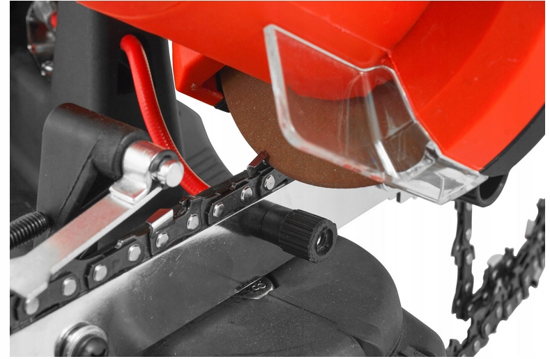 >Оснащение устройства плавной регулировкой натяжения цепи и использование регулировки угла заточки с точной шкалой позволяет производить заточку каждого звена повторяемым образом без необходимости чрезмерного его натяжения. Устройство простое в использовании и чрезвычайно интуитивно понятное. Точилка оснащена соответствующей шкалой и делением.