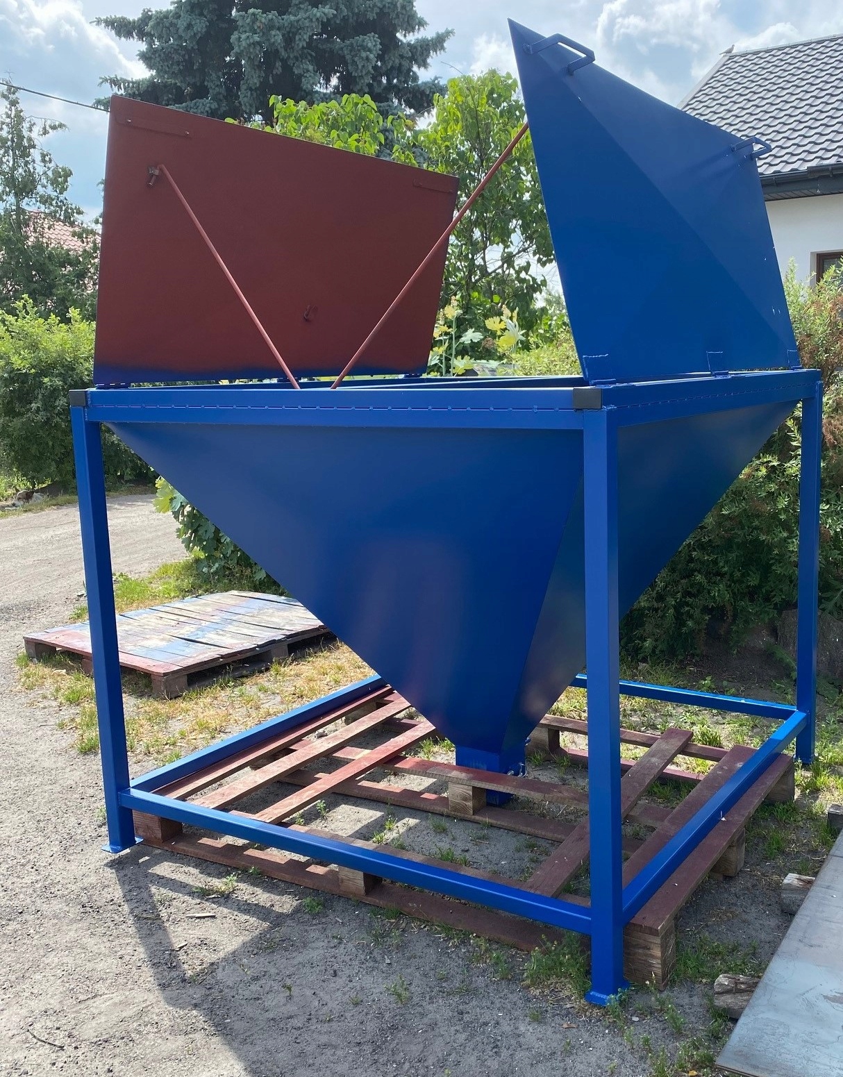 Бункер для биг-бэгов изготовлен из листового металла толщиной 2 мм, армированного квадратной трубой 50х50 и 40х40 мм. Материалы, из которых изготовлена корзина, имеют все сертификаты и допуски, это первоклассная сталь. Размеры и толщину материала, из которого будет изготовлено изделие, можно определить индивидуально.
