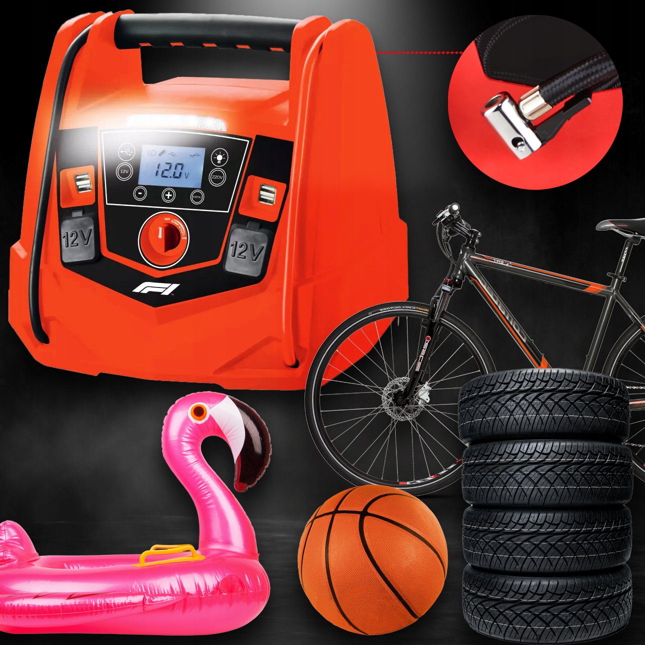 Теперь это не проблема, ведь пусковое устройство F1 10834 имеет встроенные шланги для накачивания шин и других товаров для отдыха, таких как футбольные мячи, корзины или матрасы.