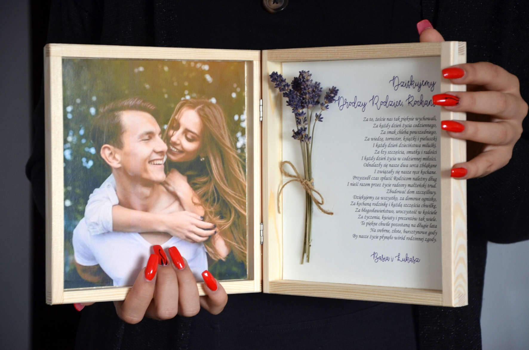 Деревянная коробка 19 x 21 см + персонализированная печать, фотография и букет лаванды p>