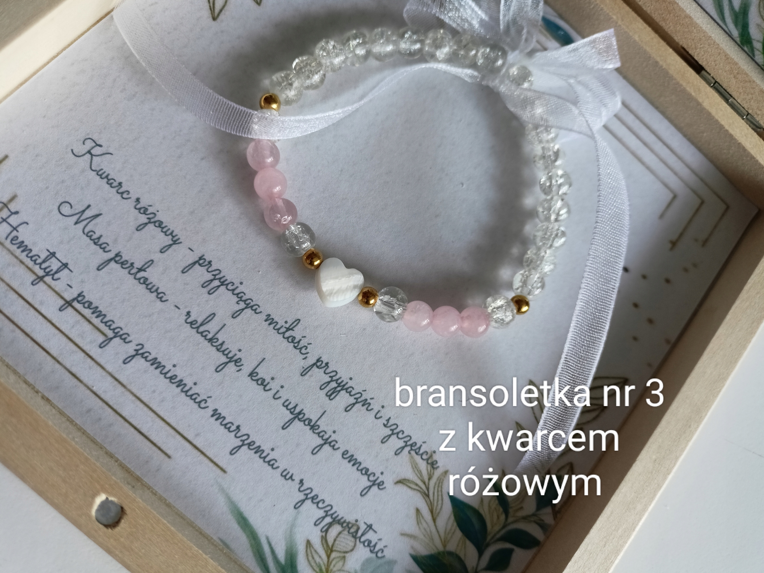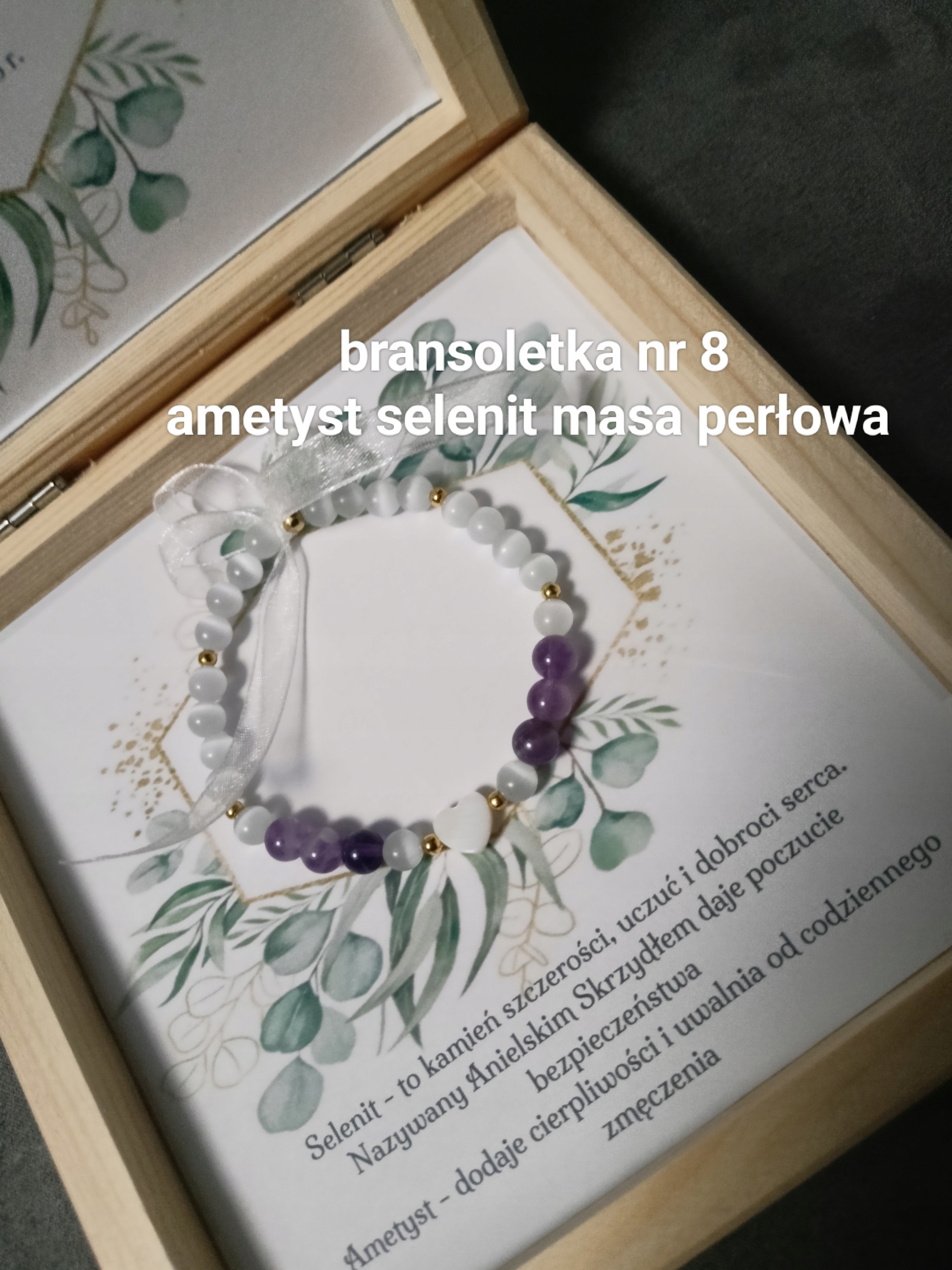 , браслеты будут упакованы с большей коробкой с размерами 14x14x2 см, и, таким образом, компоновка в середине коробки слегка изменится. Описание камней будет расположено выше или под браслетом, а не так, как было в середине браслета. Цена не меняется.
