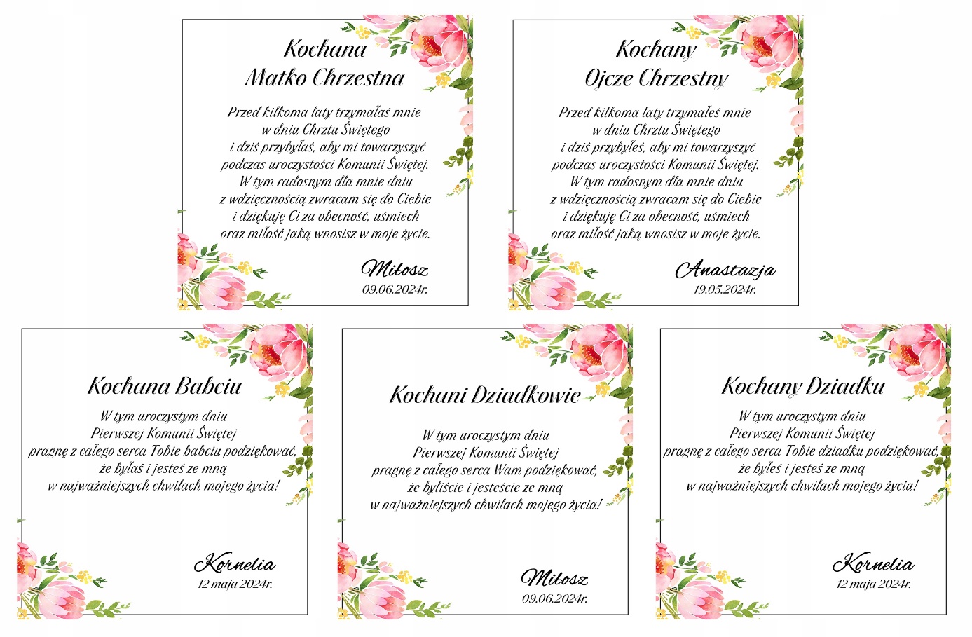 спасибо крестным родителям, бабушке, дедушке, бабушке и дедушке по случаю первого святого причастия с именем и датой церемонии.
