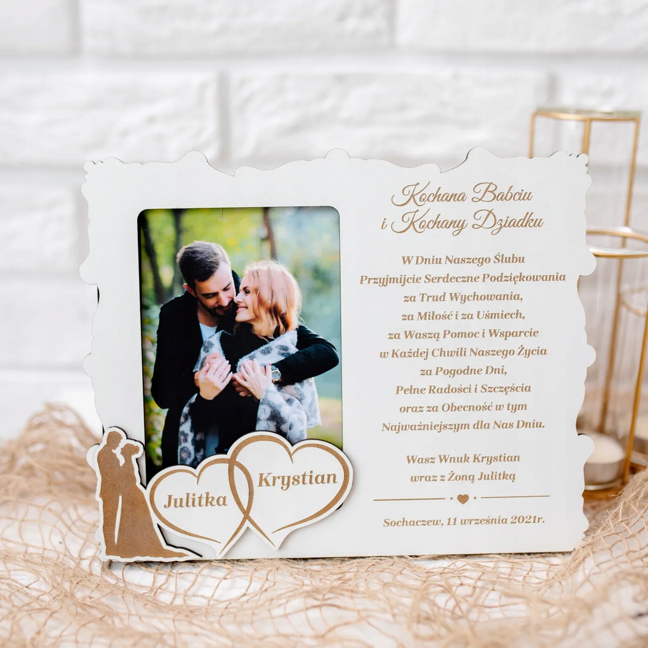 Рама изготовлен из высококачественного материала, что делает его долговечным и твердым. На кадре есть субтитры с личной посвящением, для которого имя молодой пары и дата свадьбы. Надписи по благодарности (посвящение, которому, название невесты и даты) выгравированы с использованием новейшей лазерной технологии.