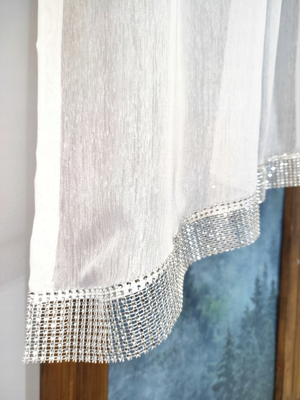 Мы предлагаем вам занавеску из белого соболя, также называемая (французская вуаль), отделанная пластиковым ремнем 6 см с цирконами. , туннель и крючки. Это позволяет отрегулировать индивидуально к ширине штор > шторы сшиты индивидуально для клиента после подачи предложения