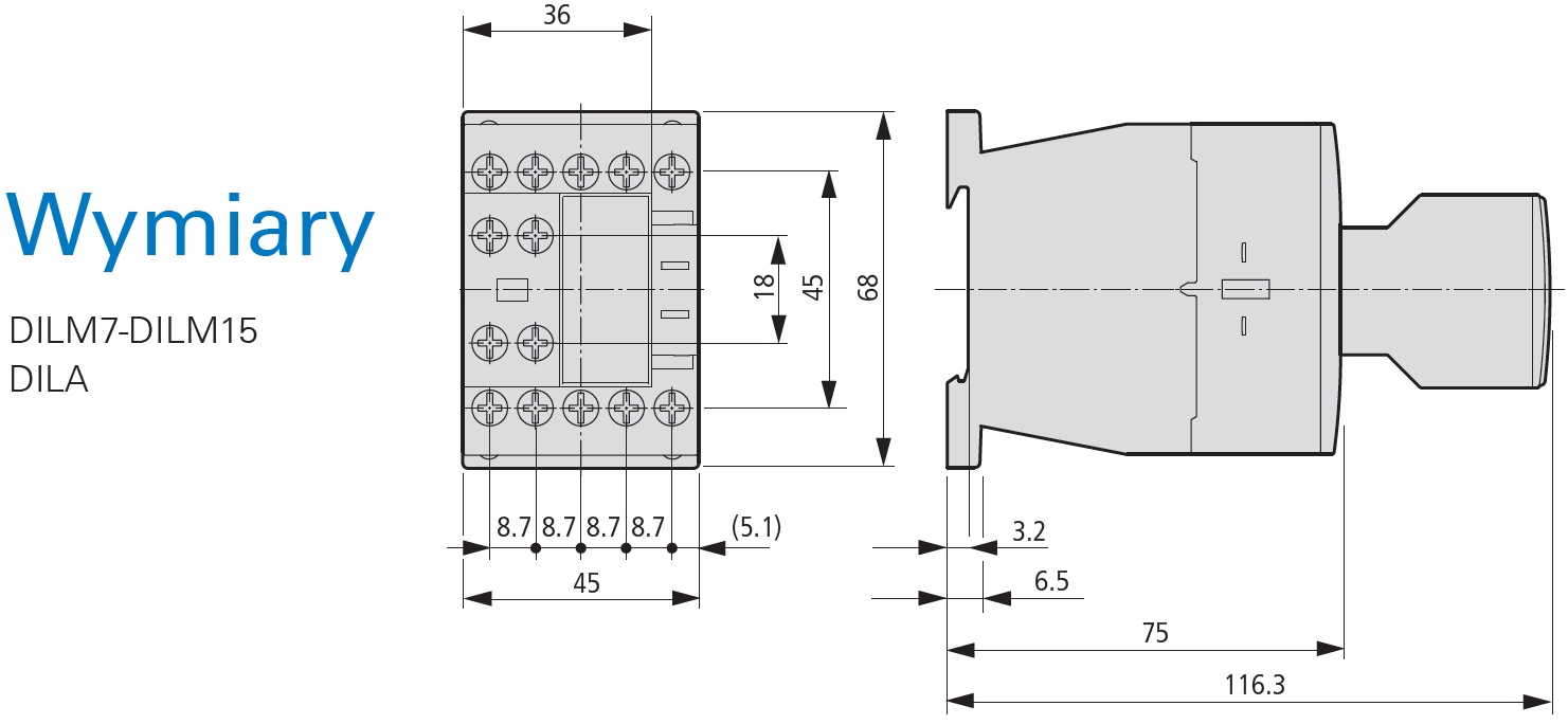 - Размеры контактора DILM: 45 мм для макс. 32 А; 55 мм для макс. 72 А; и 90 мм для макс. 170 А.