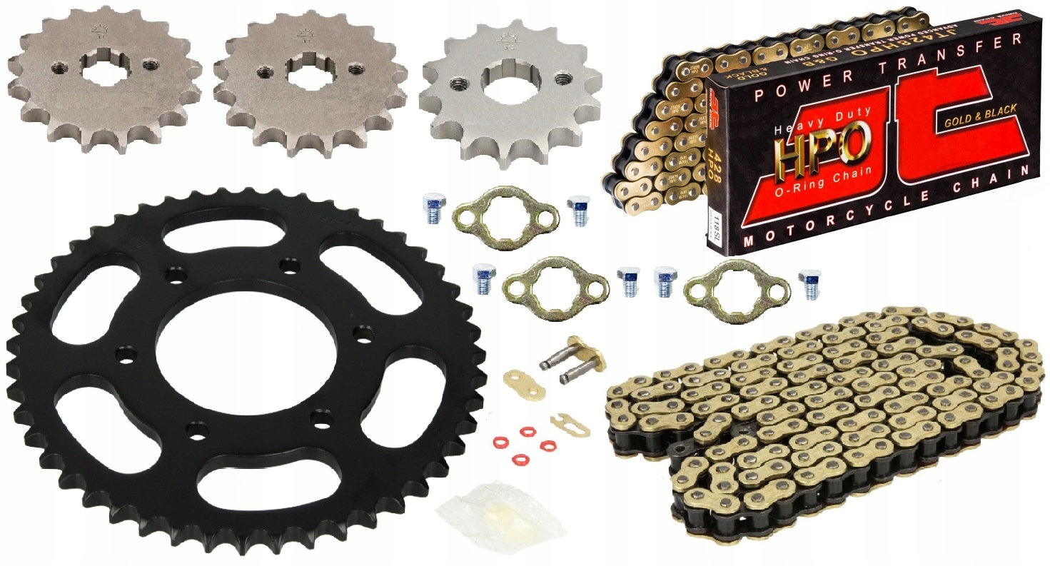Набор очень качественно и прочно изготовлен из стали высочайшего качества в соответствии с заводскими размерами, а также имеет гораздо лучший стандарт качества по сравнению с оригинальный продукт. Это позволяет полностью восстановить передачу и систему главного привода до очень прочного типа 428H. В комплект входят 4 идеально подобранные звездочки с защитой и 2 усиленные приводные цепи с уплотнительными кольцами (можно укорачивать по желанию) золотого цвета, которые, несмотря на разное количество зубьев, имеют передаточное число, близкое к оригинальному. Детали вставляются в оригинальные монтажные отверстия без каких-либо доработок. На фотографиях представлен реальный внешний вид товара. Благодаря проверенному высокому качеству они обеспечивают длительную и безотказную работу.