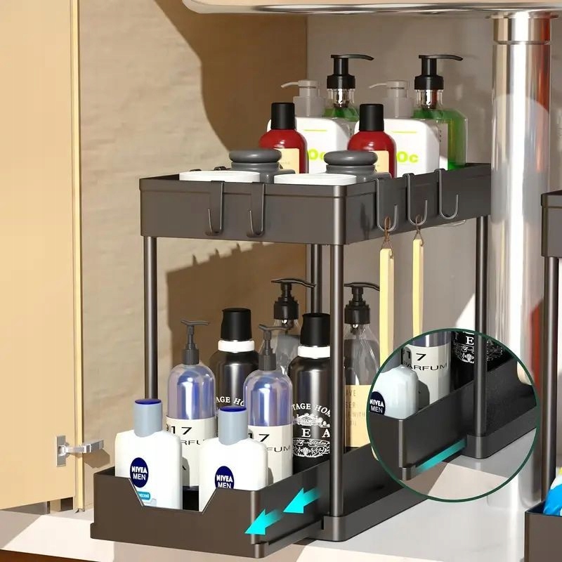 2-уровневое место для хранения под шкафом создает аккуратное место для хранения под раковиной.
