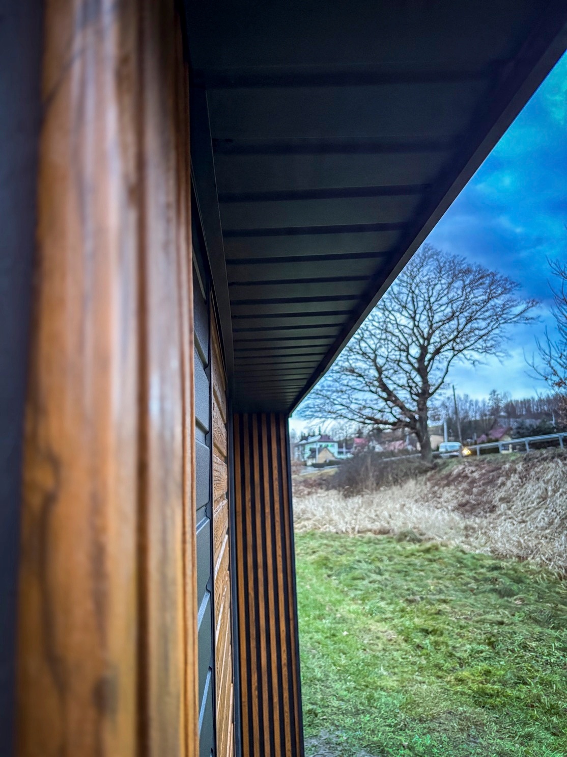 • Мощность крыши на передней стенке 0,5 м построена с правой стеной здания Soffit + с декором из ламеллов. Легкий орех