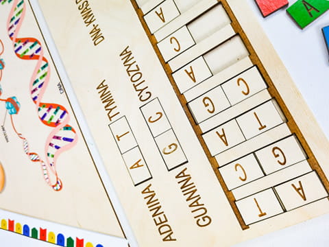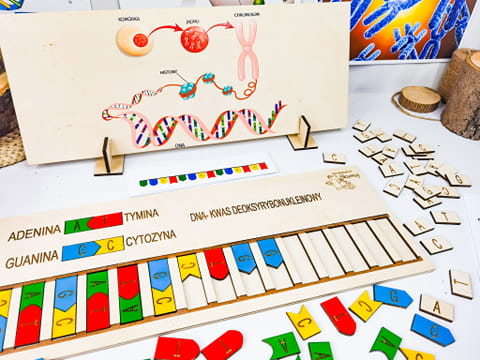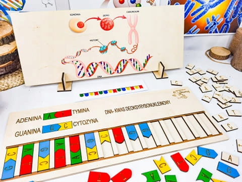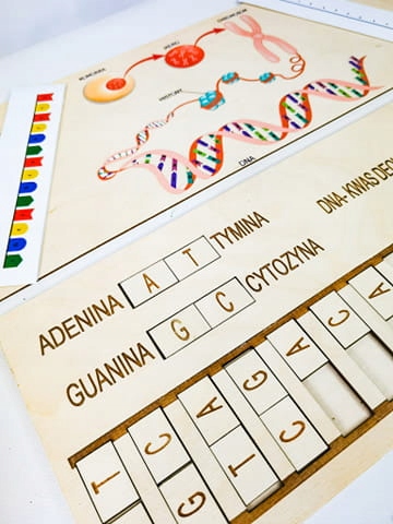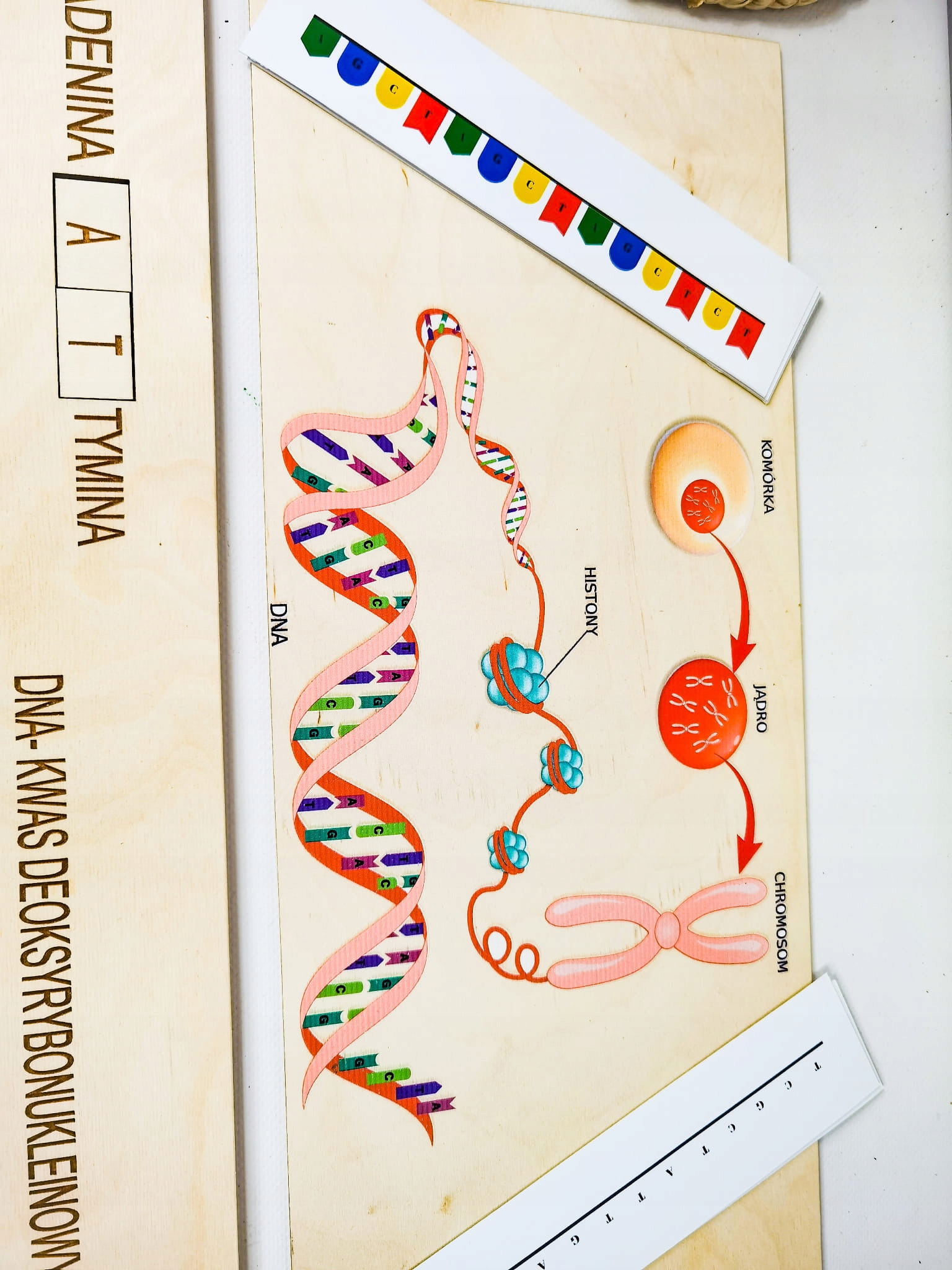 Интегральным дополнением к набору является головоломка, в которой ребенок создает цепь ДНК на основе прикрепленных карт (напечатанных на бумаге 300 г) или порядок правил азота изобретает себя. Мы начинаем веселье, кладя легенду в левом углу головоломки. Он должен быть размещен там с Гвинеей, цитозином, аденином и тируином, чтобы ребенок знал, как он выглядит.