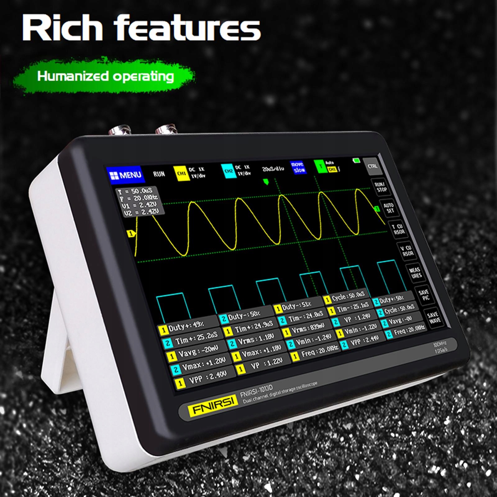 Большой полнодюймовый экран, полностью оснащенный 7-дюймовым экраном. -дюймовый цветной дисплей с разрешением 800*480, яркими цветами и высокой контрастностью; Сенсорный метод – емкостный сенсорный экран. входной канал, с 2 входными каналами, входное сопротивление 1 МОм, может одновременно измерять 2 группы различных сигналов, может сравнивать входы 2 групп сигналов для оценки и анализа проблем, интеллектуальная защита, построены 2 группы входных каналов - в модуле с повышенной защитой, выдерживает входное напряжение до 400В.
