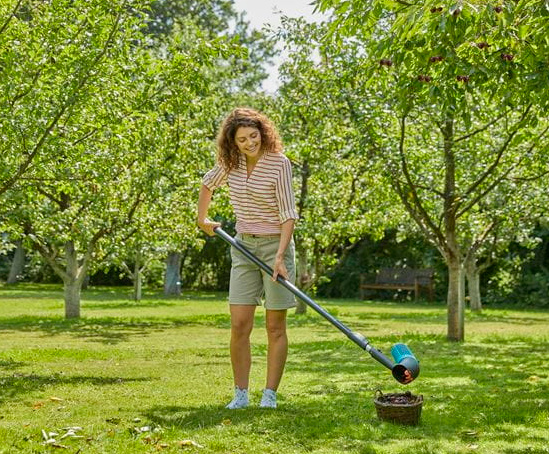 Благодаря практичной ручке для переноски сборщик можно использовать для сбора фруктов прямо с куста. Идеальный рабочий угол обеспечивает хороший обзор собираемых фруктов. Вращающийся наконечник особенно практичен: узкие зубцы предназначены для сбора ягод, а более широкие — для сбора косточковых. Емкость 0,8 л позволяет собирать большое количество слив и вишен. Благодаря небольшой ножке сборщик ягод можно поставить на землю.