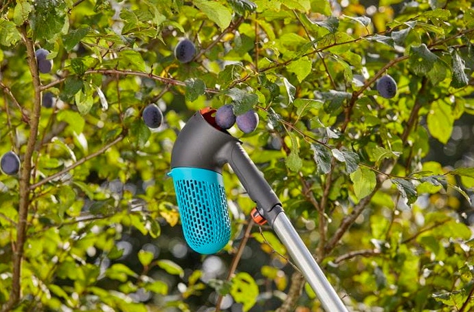 Вращающийся наконечник с зубцами разного размера позволяет собирать разнообразные фрукты: узкие зубцы предназначены для сбора более мелких ягод, а более широкие – для сбора ягод. косточковые фрукты