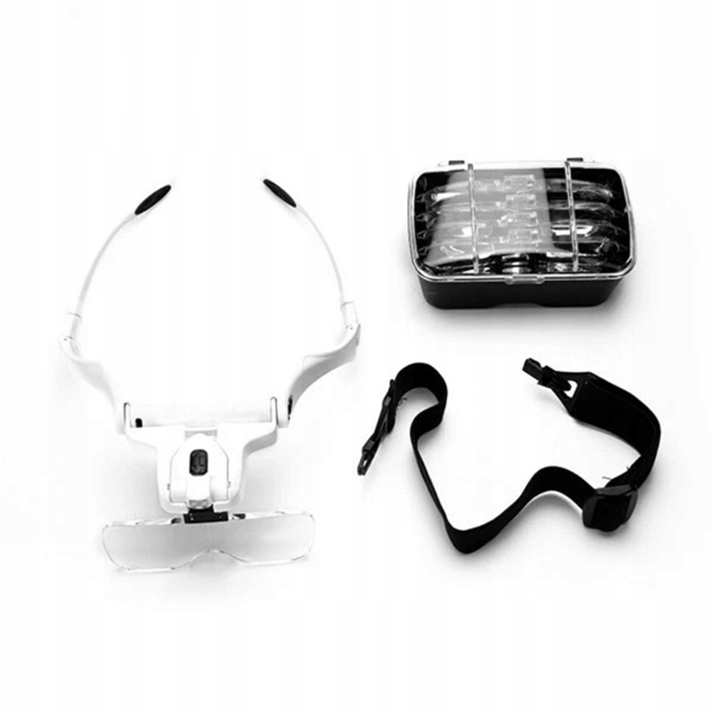 - Оснащен двумя регулируемыми светодиодными фонарями посередине, оголовье также регулируется и можно легко переключать 5 различных степеней увеличения.