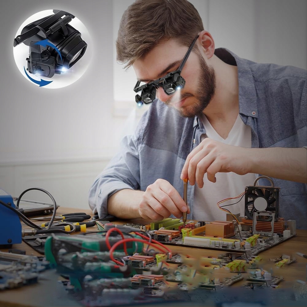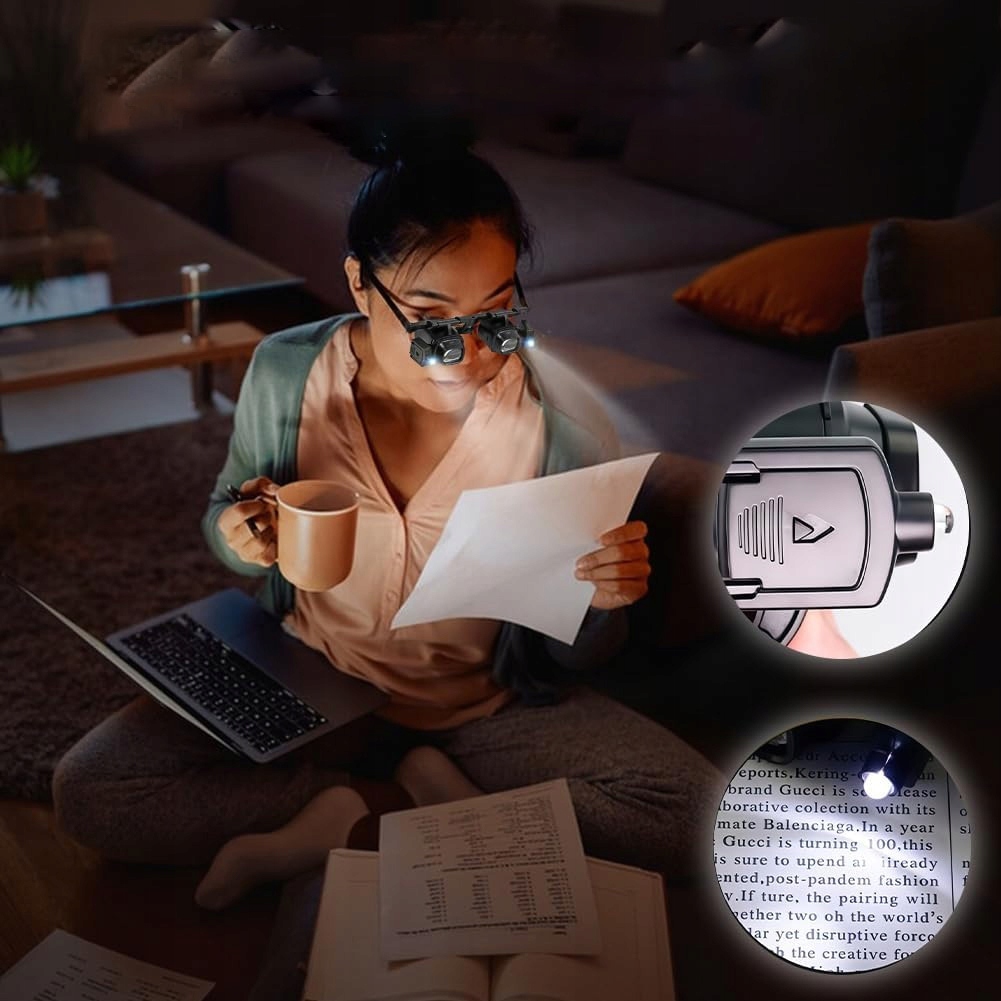 🔎🔎🔎Дизайн с креплением на голову: лупа для чтения с креплением на голову имеет эргономичную и легкую конструкцию, обеспечивающую удобство ношения даже при длительном использовании. Прочная оправа очков идеально прилегает к лицу, не давя на нос, что делает их идеальными для повседневного использования. Оголовье остается на месте, а лупа не соскальзывает.