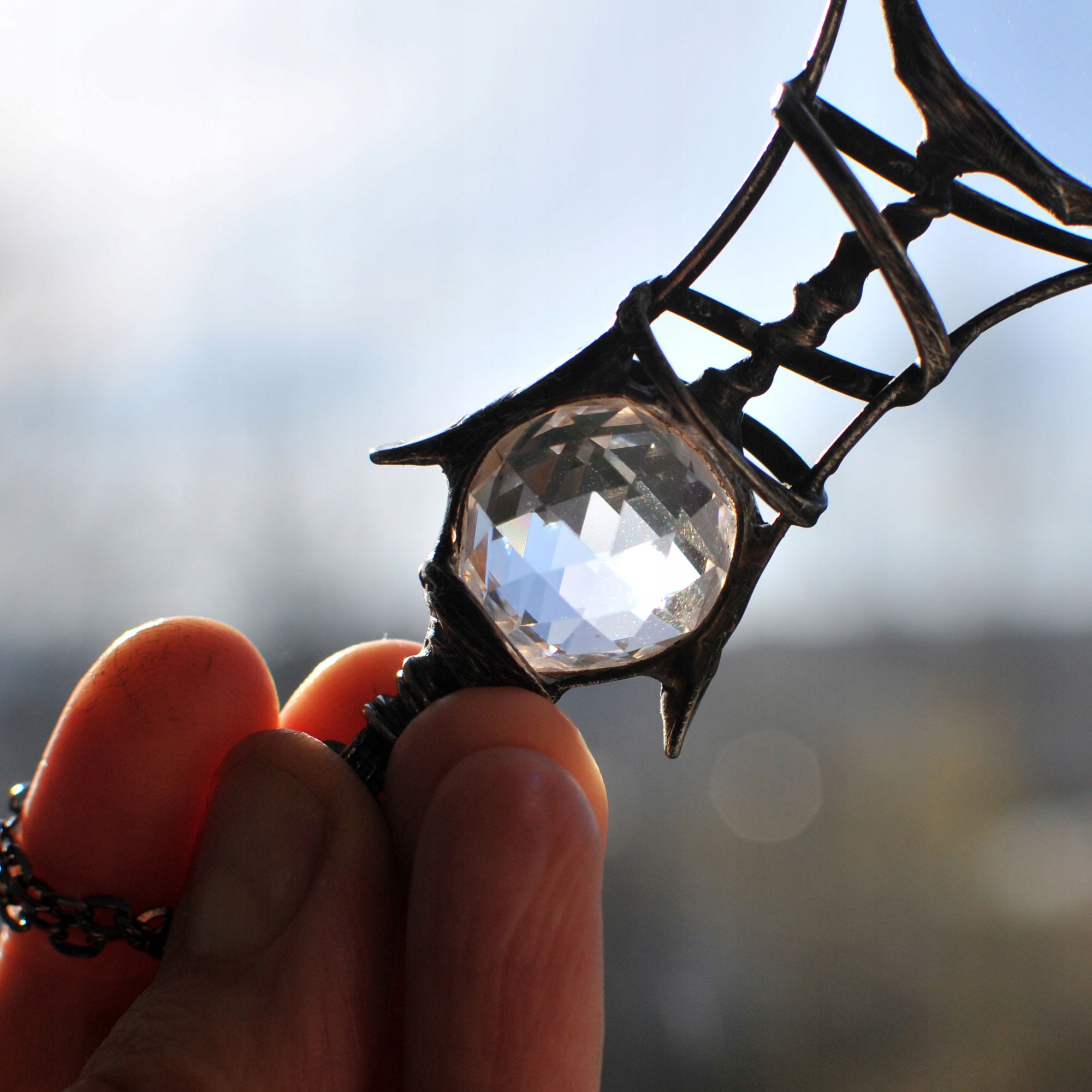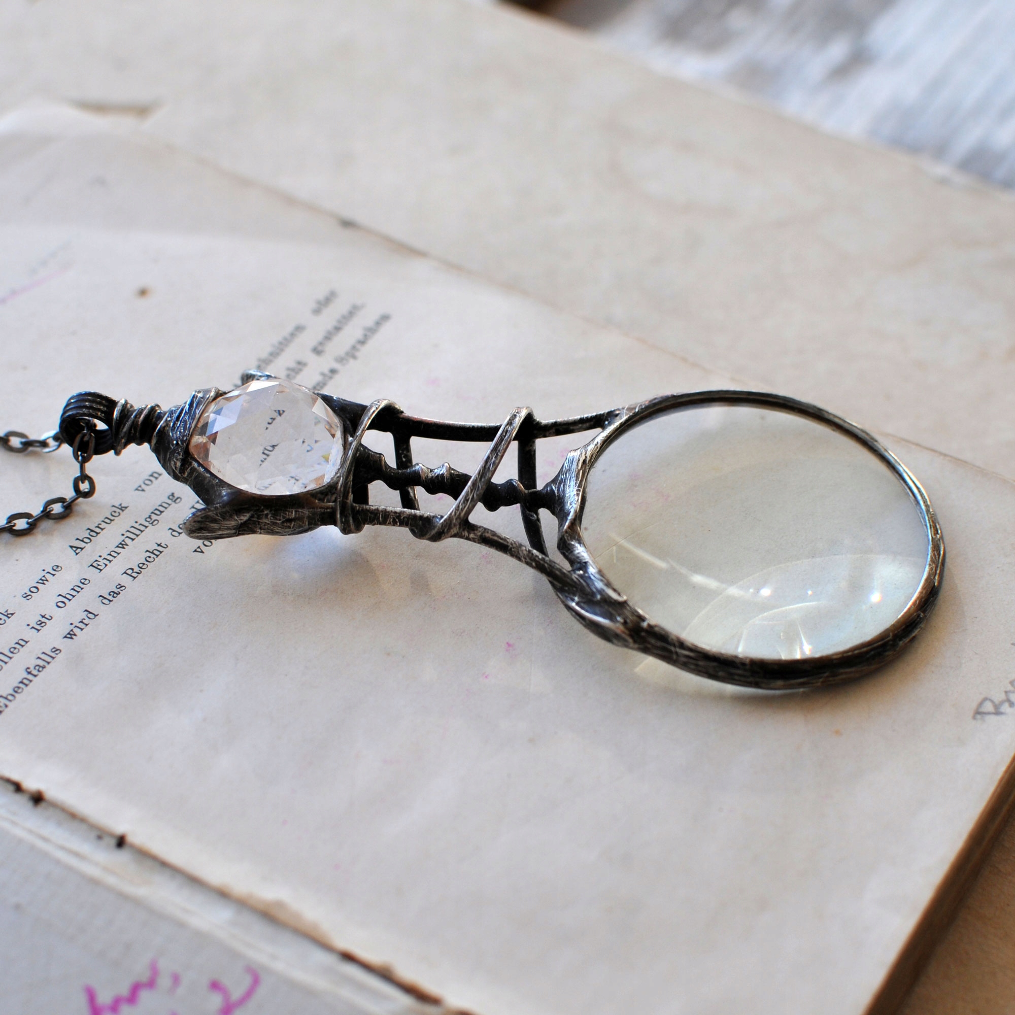 Ожерелье с увеличительным стеклом в художественной оправе из жести. Дополнительно украшен декоративным элементом в виде шара с призмой.