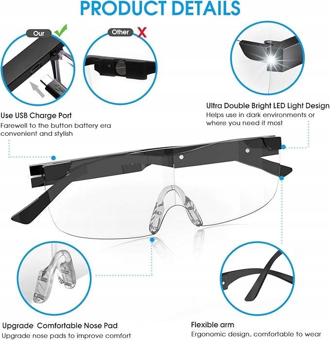 - Освободите руки: увеличительные очки без помощи рук помогают повысить производительность и поддерживают точность зрения при выполнении повседневных задач крупным планом. Их можно носить как обычные очки, а руками можно делать все что угодно.