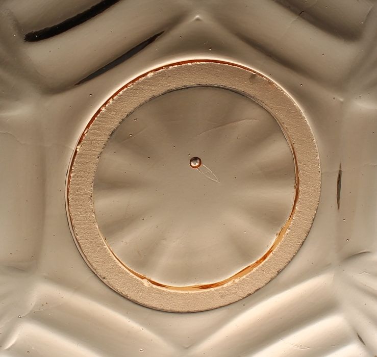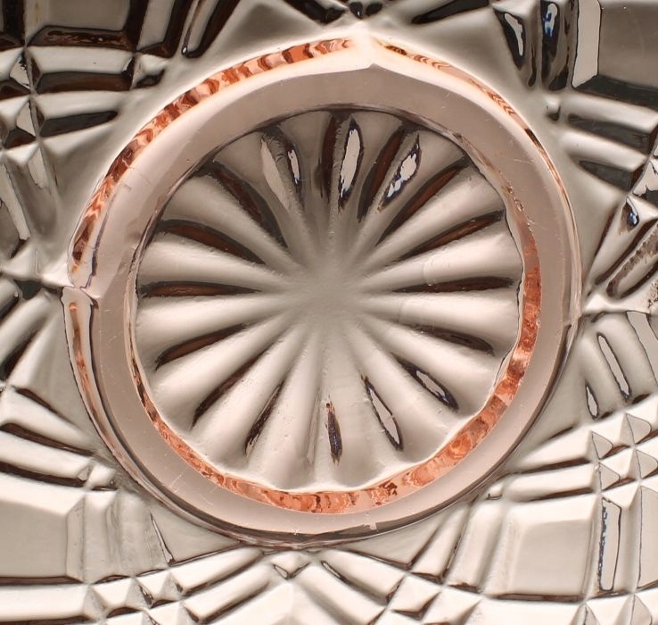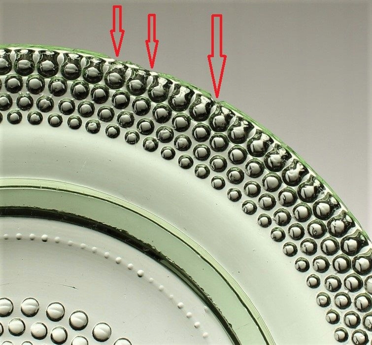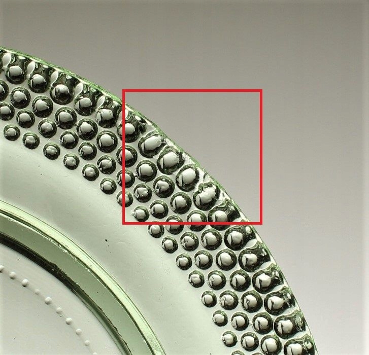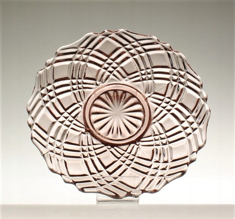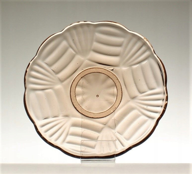 Шесть десертных тарелок из цветного прессованного стекла. Тарелки происходят от Домашнего стекольного завода «Зомбковице» в Домбровой Гурнице (синяя тарелка в стиле модерн с каймой из шариков из серии № 1210 и розовая модель, украшенная пересекающимися полосками), от Домашнего стекольного завода «Гортензия» в Петркуве-Трыбунальском ( модели № 416 с пальмой (переливающейся), 521 и 509) и одна безымянная тарелка в стиле арт-деко с матовой розой на нижней поверхности.