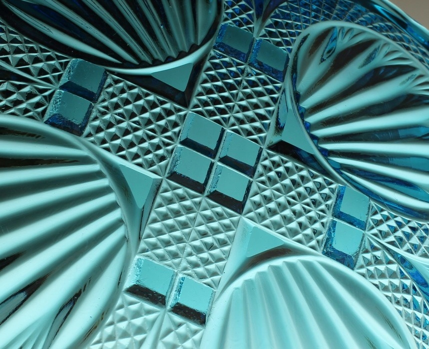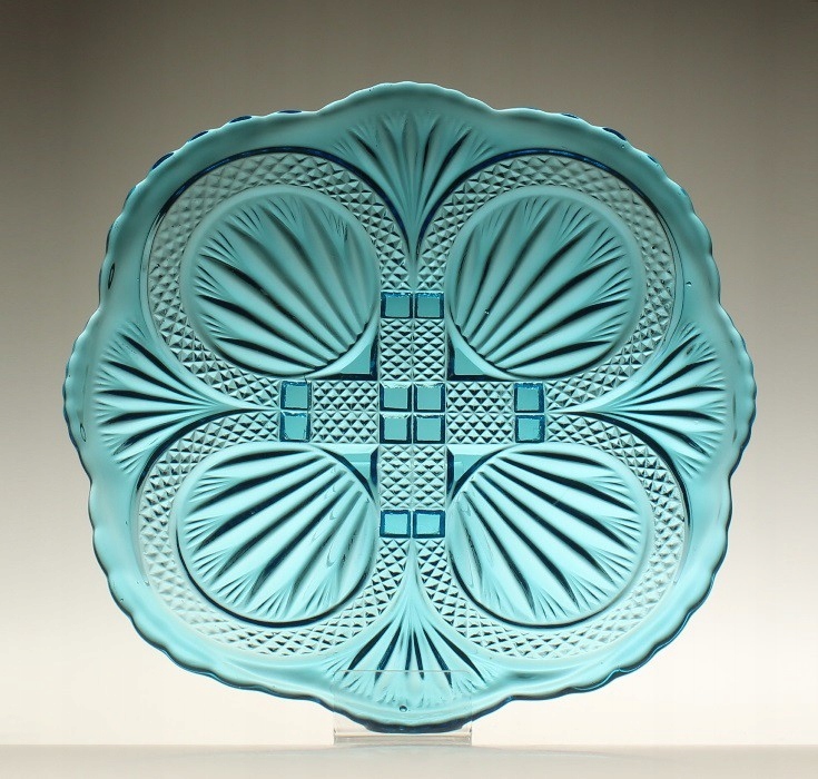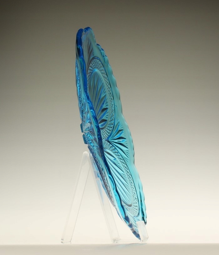 Тарелка из синего прессованного стекла. Выполнена в стиле модерн. Имеет квадратную ажурную основу. Произведено на отечественном стекольном заводе «Зомбковице» в Домбровой Гурнице. В каталоге 1920 г. имеет номер 1226/V1/2. Серия Верре Бриллиант.