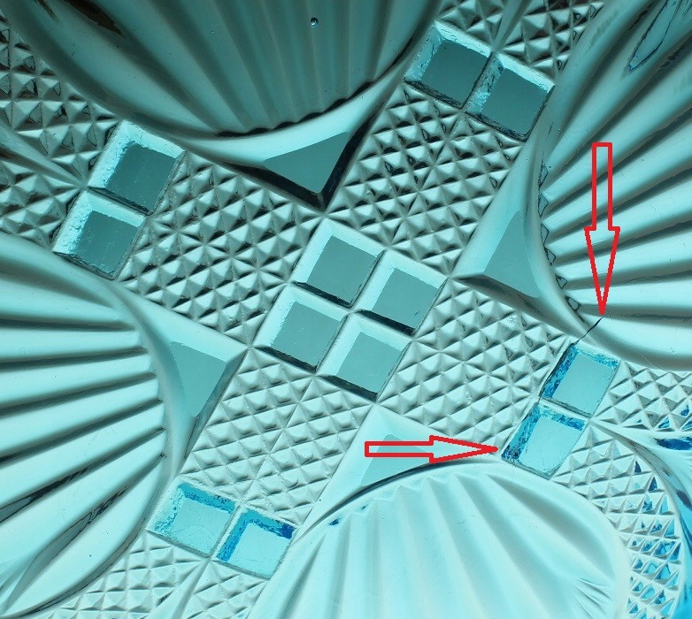 На поверхности всего несколько функциональных царапин. Зубья по верхнему краю без дефектов и шероховатостей. На квадратах основания имеются незначительные неровности и микротрещины. Вдоль одной пары базовых квадратов имеется дефект в виде трещины (длиной около 4 см) – поверхность стекла в этом месте не повреждена.