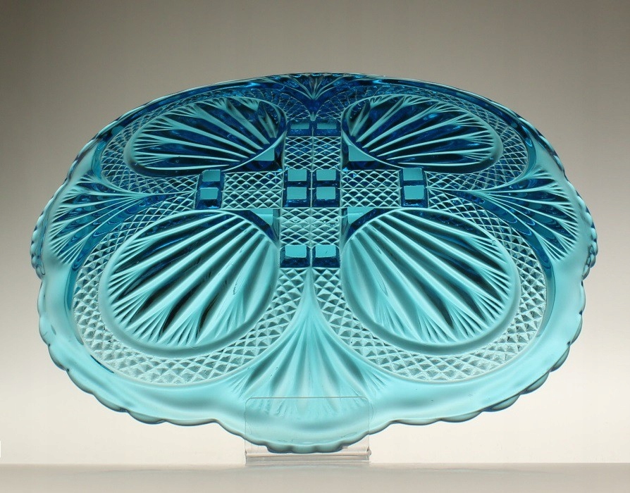 Пластина из синего прессованного стекла. Сделано в стиле искусства. У него есть квадратная, открытая шлифовальная база. Он происходит от экономического стекла «Ząbkowice» в Дыбровой Горнич. В каталоге 1920 года. Имеет номер 1226/V1/2. Серия из верховой бриллинги.
