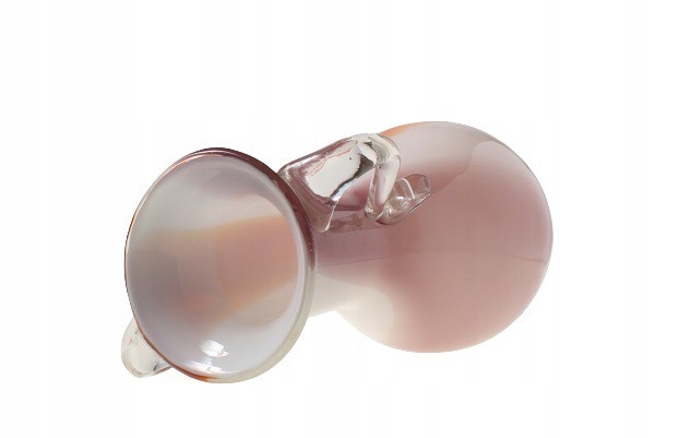 Ваза с ручками из трехслойного натриевого стекла: снаружи бесцветное, внутри слой молочно-белый, средний слой молочно-красного и баклажанового цветов. Уши бесцветные. Ваза произведена на Тарновецком стекольном заводе в Тарновце. Польское художественное стекло, 1980-1990-е годы.