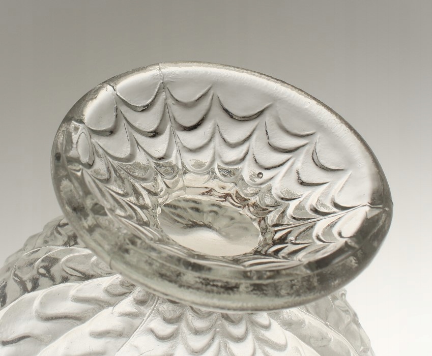 Внутри чаши есть несколько коротких царапин и небольшой дефект. На верхнем крае в двух местах имеются лопнувшие пузырьки воздуха. Край основания свободен от сколов.