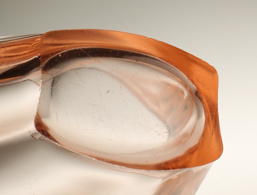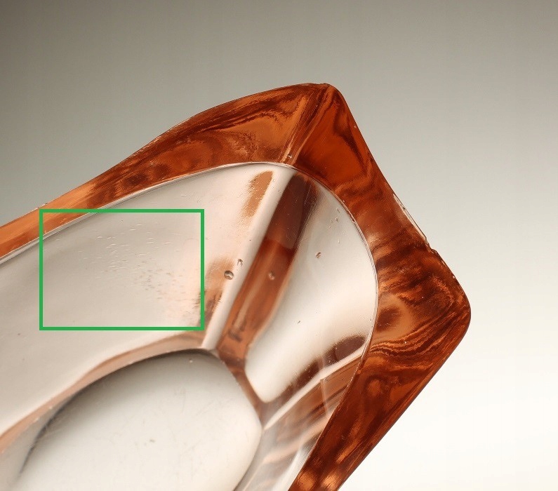 Всего несколько функциональных царапин внутри и снаружи чаши. На верхней кромке имеются два микроповреждения около 2 мм и небольшая заводская шероховатость. Одно микроповреждение около 2 мм на двух углах основания и микровмятины на его краях. Пузырьки воздуха в стеклянной массе. Снаружи чаши, на одной из передних стенок, имеется скопление точек, которые можно почувствовать под кончиком пальца – они заводского происхождения.