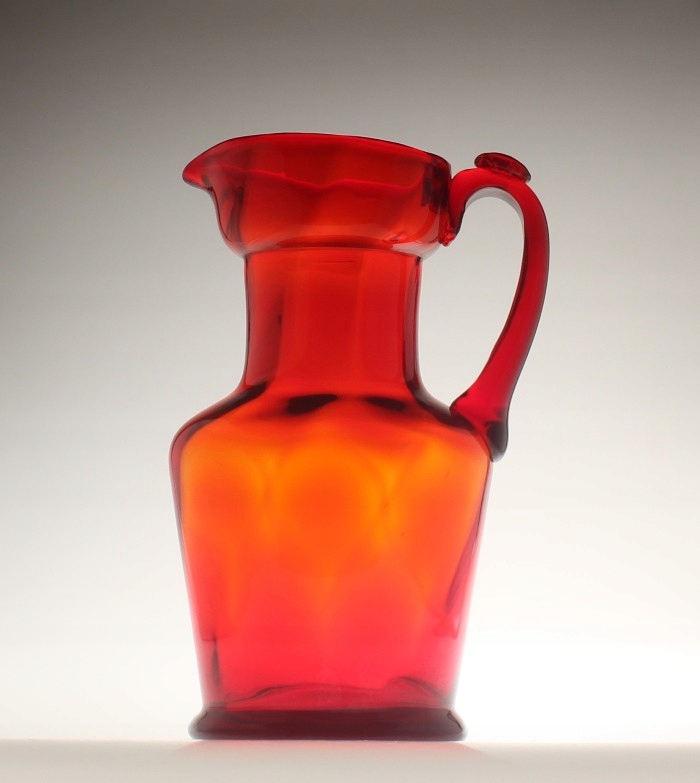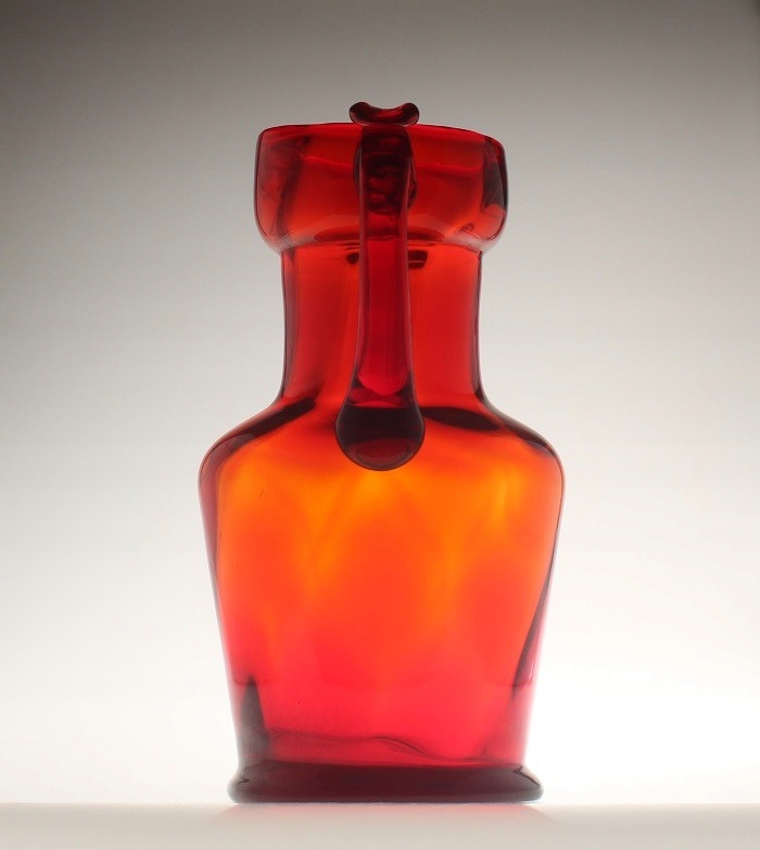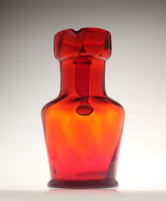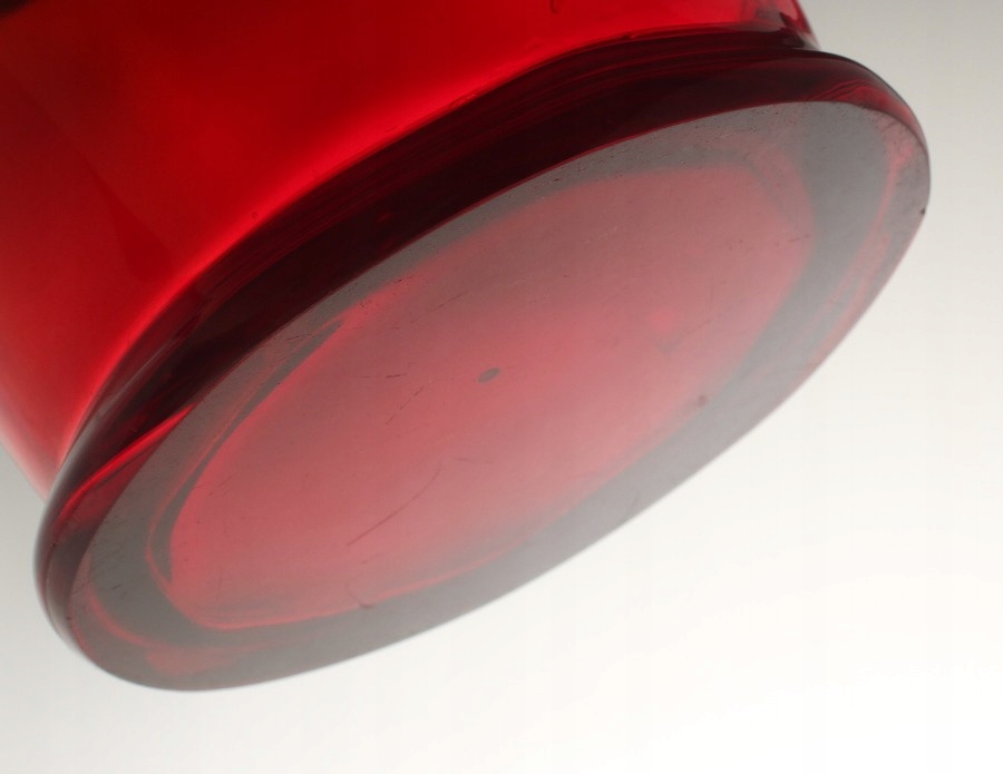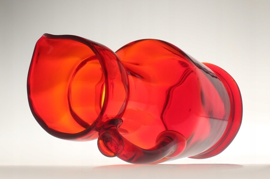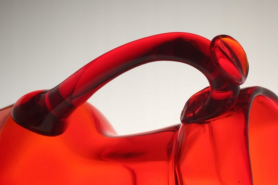 Красный кувшин из содового стекла ручной формовки. Произведено на заводе художественного стекла «Сташиц» в Домбровой Гурниче, который является филиалом завода по производству домашнего стекла «Зомбковице» в Домбровой Гурниче. Дизайн Людвика Федоровича. 1970-е/1980-е годы