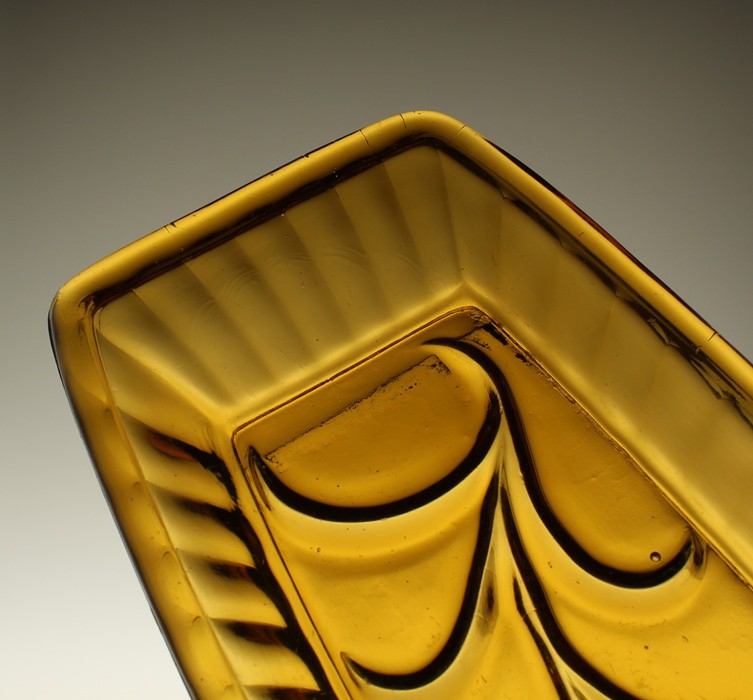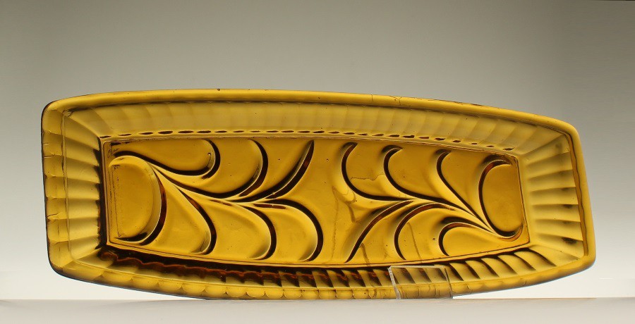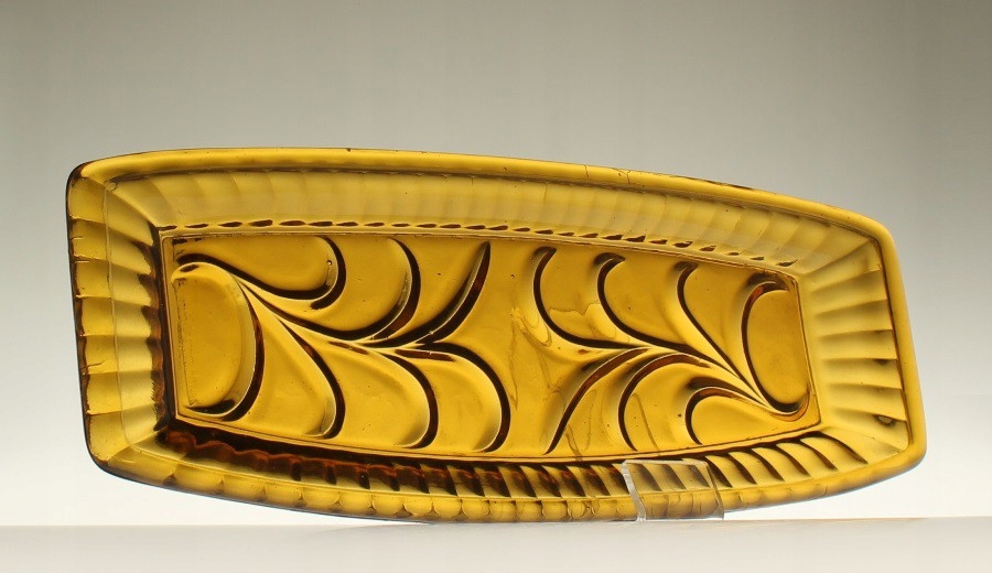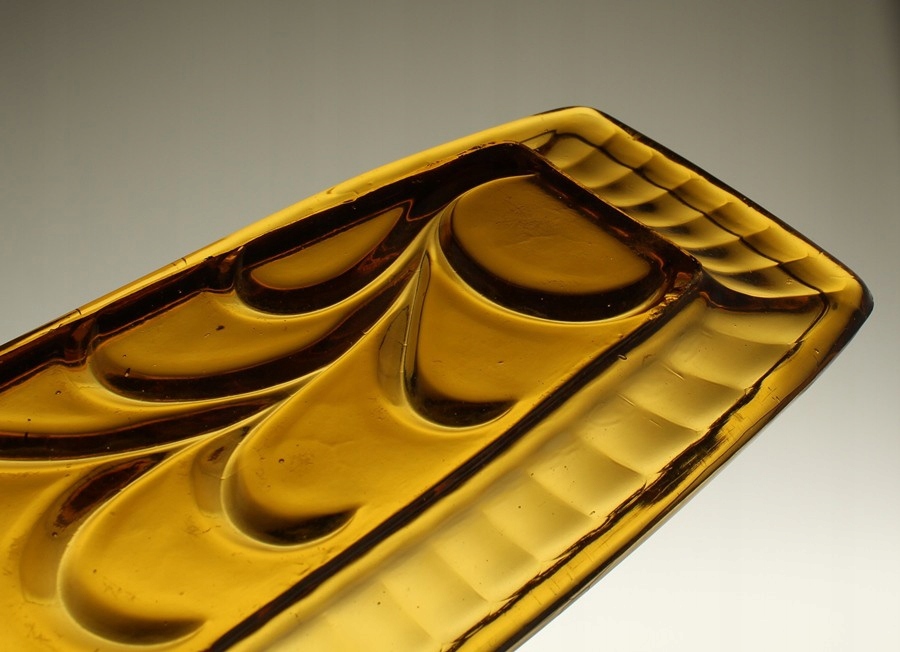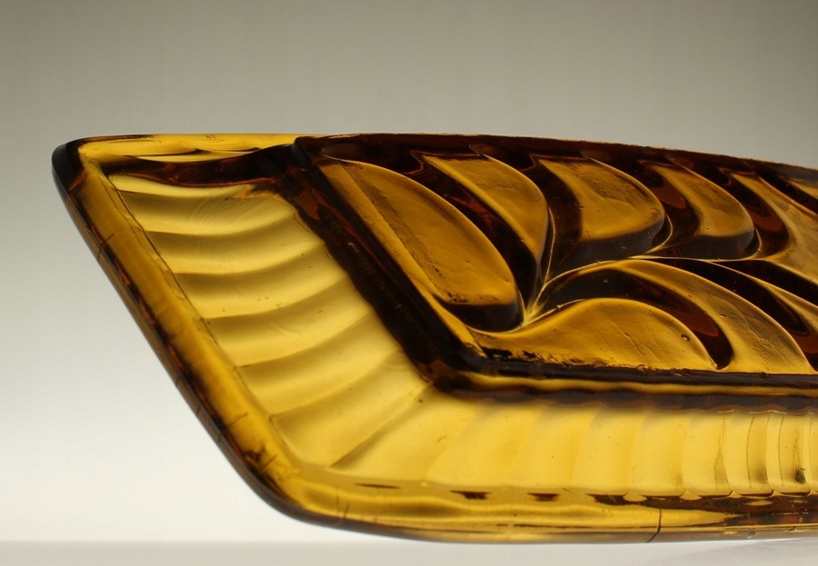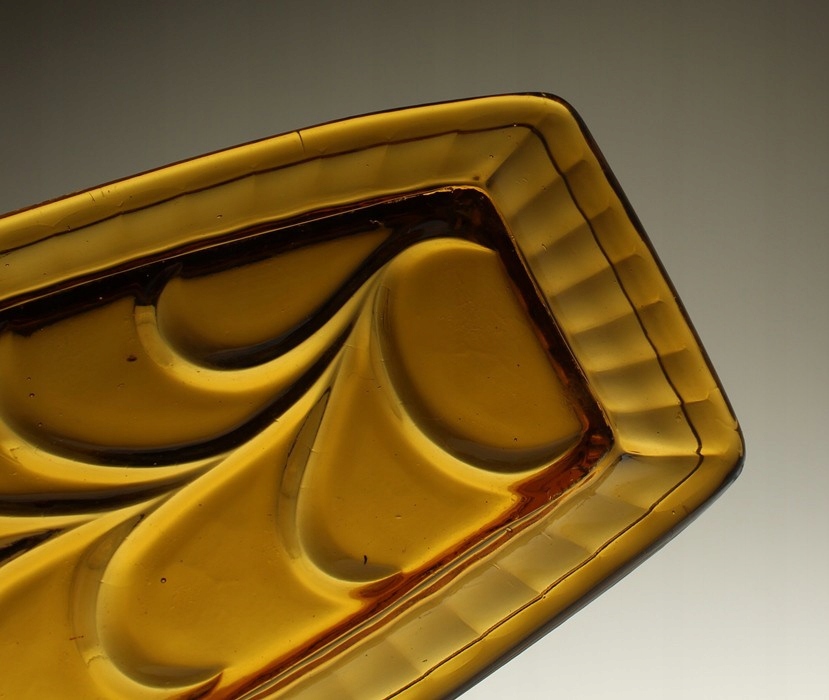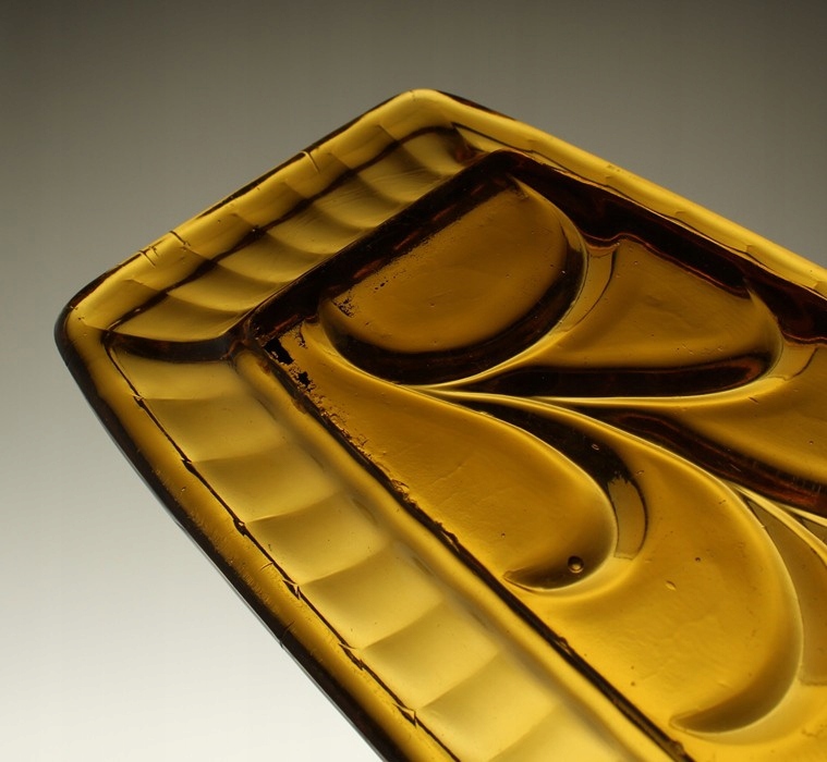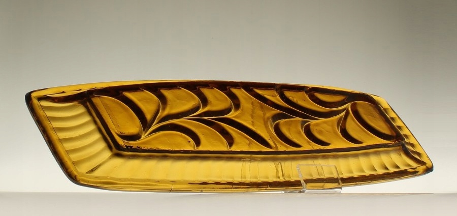 Неглубокий поднос из прессованного медового стекла. Ребристый воротник, низ чаши украшен растительным мотивом. Поднос родом из Домашнего стекольного завода «Зомбковице» в Домбровой Гурнице. Каталожный номер 2412.